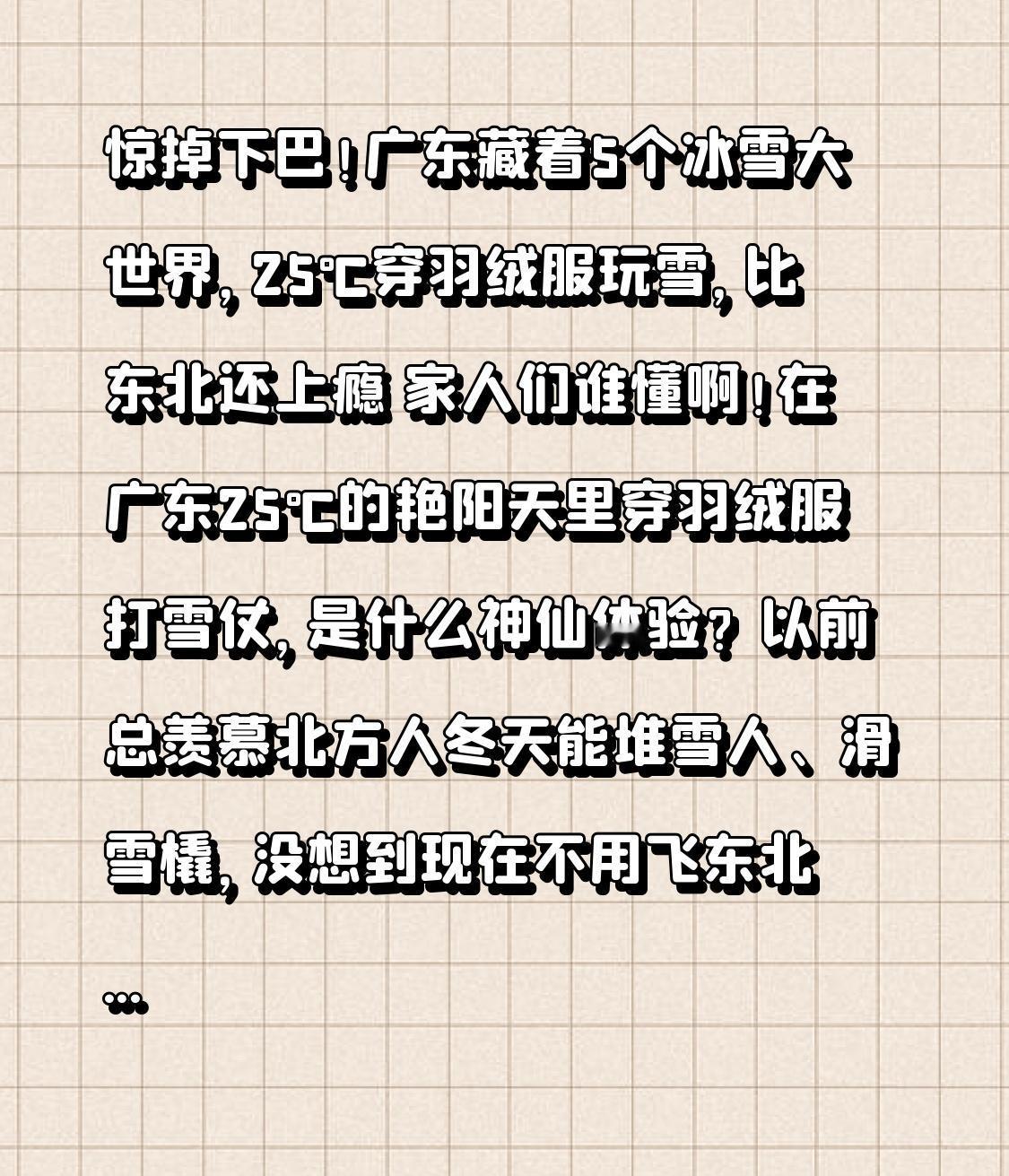 惊掉下巴!广东藏着5个冰雪大世界,25℃穿羽绒服玩雪,比东北还上瘾 家人们谁懂啊!在广东25℃的艳阳天里穿羽绒服打雪仗,是什么神仙体验?以前总羡慕北方人冬天能堆雪人、滑雪橇,没想到现在不用飞东北,在广州、深圳、江门的家门口,就能闯进零下30℃的冰雪王国,南方娃第一次见雪的尖叫,比东北的雪还热闹! 你是不是也以为广东只有凉茶和早茶?大错特错!现在的广东,早就把“北雪南移”玩明白了。广州花都的热雪奇迹,7.5万㎡的超大室内雪场相当于10个足球场,50cm厚的真雪踩上去咯吱作响,常年恒定-6℃的气温,进门瞬间从盛夏穿越到寒冬。最绝的是分了滑雪区和娱雪区,新手能在8°的小熊道慢慢摸索,大神能在21°的老虎道炫技,小朋友则在飘雪区追着雪花跑,12台飘雪机打造的漫天飞雪,随手一拍就是《情书》同款大片。 第一个转折点来了:广东的冰雪世界不止会“造雪”,还藏着超多黑科技!深圳前海的冰雪乐园是全球最大室内滑雪场,463米的专业雪道落差83米,连外国滑雪大神都来打卡,说体验完全不输北方雪场。更神奇的是智能雪板,传感器能实时分析动作,滑雪机器人还会陪你互动撒雪,5岁小朋友跟着免费公开课,半小时就能解锁基础滑行技能,教练都夸南方娃平衡感超棒。 第二个反转更惊喜:从广州到江门,每个冰雪乐园都有专属特色!江门古劳水乡的冰雪大世界,1000多㎡的场地里藏着哪吒冰雕、玫瑰冰墙,三种冰雪滑道让你体验“冰上冲浪”,凭景区门票就能免费玩,夜场49元还能畅玩尖叫岛所有项目。东莞水濂山的乐民冰雪世界,靠近百鸟园的地理位置超适合亲子游,冰滑梯、雪地单车承包全家欢乐,工作人员还会免费帮忙拍雪景照。番禺的越美冰雪大世界更贴心,不仅免费提供雪服、雪鞋和护膝,出来还能喝到驱寒姜茶,怕冷星人也能安心畅玩。 更让人上瘾的是“冰火两重天”的独特体验!白天在雪场里摔得浑身是雪,晚上就能去从化泡温泉看星星,或者钻进茶楼点一份炭步芋头糕、梯面山水豆腐花,热乎的广式美食配刚玩完雪的清凉,幸福感比在东北捧着热巧克力还绝。而且交通超方便,广州的坐地铁9号线转个车就到,深圳的港深通关后有直达巴士,香港游客都说“相当于把雪场搬在了家门口”。 第三个关键反转:这里早已不是“小众玩法”,而是全民狂欢的乐园!广州的冰雪季会搞东北雪乡主题活动,穿花棉袄、吃冻梨,一秒穿越到哈尔滨;全国青少年室内滑雪公开赛落地广州,南方孩子虽然起步晚,但柔韧性突出,表现惊艳全场。就连满头白发的阿姨,都能在教练指引下优雅旋转,广东省滑雪队的成立,更让南方人的冰雪梦有了专业舞台,候选队员一句“我们也能代表国家参赛”,听得人热血沸腾。 其实广东的冰雪大世界,藏着南方人对雪的所有期待。不用忍受北上的千里奔波,不用纠结假期不够,花几十到几百块,就能让孩子体验堆雪人的快乐,让成年人找回童年的纯粹。从十年前“南方人见雪稀罕”,到现在“家门口玩雪常态化”,这些冰雪乐园不仅是游玩胜地,更是广东人生活越来越丰富的见证。 这个冬天,别再羡慕北方的雪了!约上家人朋友,去广东的冰雪大世界,穿羽绒服在25℃的艳阳天里打雪仗、滑雪橇,感受这份独属于南方的冬日浪漫。你最想去广东哪个冰雪乐园?评论区聊聊你的选择,点赞转发给想去玩雪的朋友,一起解锁家门口的冰雪快乐!