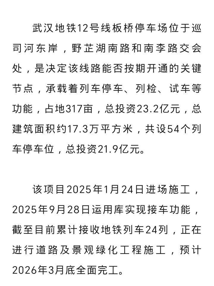 武汉地铁12号线正在空载试跑 首开段预计今年5月具备开通条件 武汉地铁12号线计划分两期开通: 首开段由钢都花园站至墨水湖公园站,目前车站及区间已全部完工,正在开展试运行,预计2026年5月具备开通条件; 二期工程由十里铺站至科普公园站,车站主体结构基本完工,区间盾构、附属结构、装修正全速推进,预计2026年国庆节具备开通条件。 网页链接 武汉地铁12号线正在空载试跑 首开段预计今年5月具备开通条件 武汉地铁12号线是亚洲最长的地铁环线,也是武汉唯一的地铁环线。 武汉地铁12号线计划分两期开通: 首开段由钢都花园站至墨水湖公园站,目前车站及区间已全部完工,正在开展试运行,预计2026年5月具备开通条件; 二期工程由十里铺站至科普公园站,车站主体结构基本完工,区间盾构、附属结构、装修正全速推进,预计2026年国庆节具备开通条件。 截至目前,武汉地铁建成线路12条,运营里程518公里、车站312座。在建地铁项目8个,分别为12号线首开段、12号线二期、10号线一期、11号线四期、12号线连接线、34号线一期、3号线二期、6号线三期,总里程145公里,总投资1355亿元。 网页链接