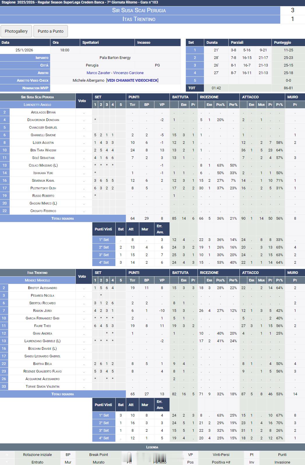 【意超男排佩鲁贾3-1特伦蒂诺 MVP本塔拉24分】国际排坛战报速递 1月25日