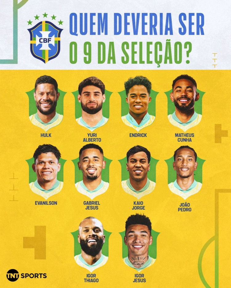 直播吧1月26日讯在上周的各联赛比赛中多名巴西前锋表现出色,TNT列出的10名可以出任9号位的球员中,恩德里克、库尼亚、热苏斯、伊戈尔·蒂亚戈在列。世界杯即将到来,哪位球员将入选安切洛蒂的球队阵容,代表巴西出战这项赛事。