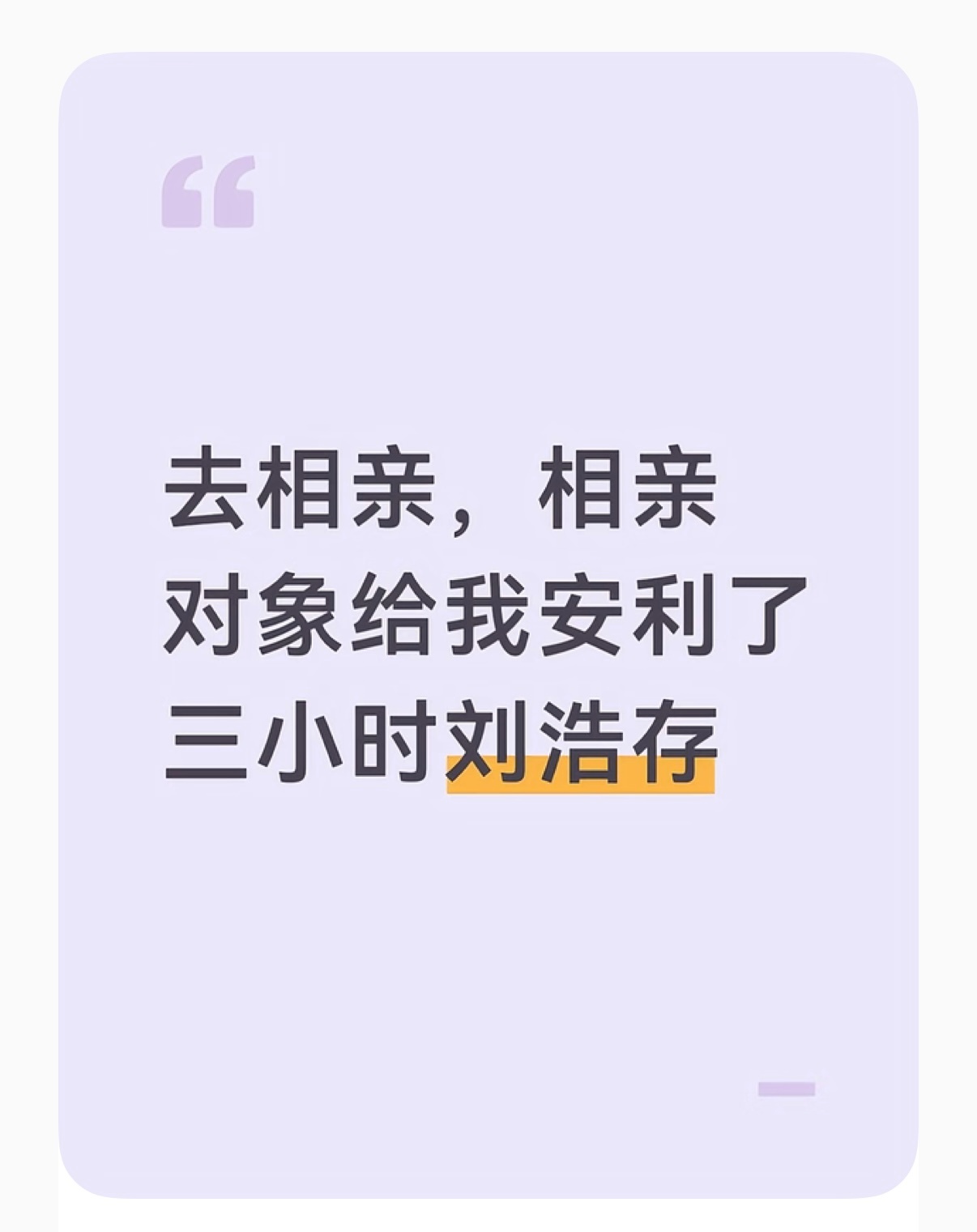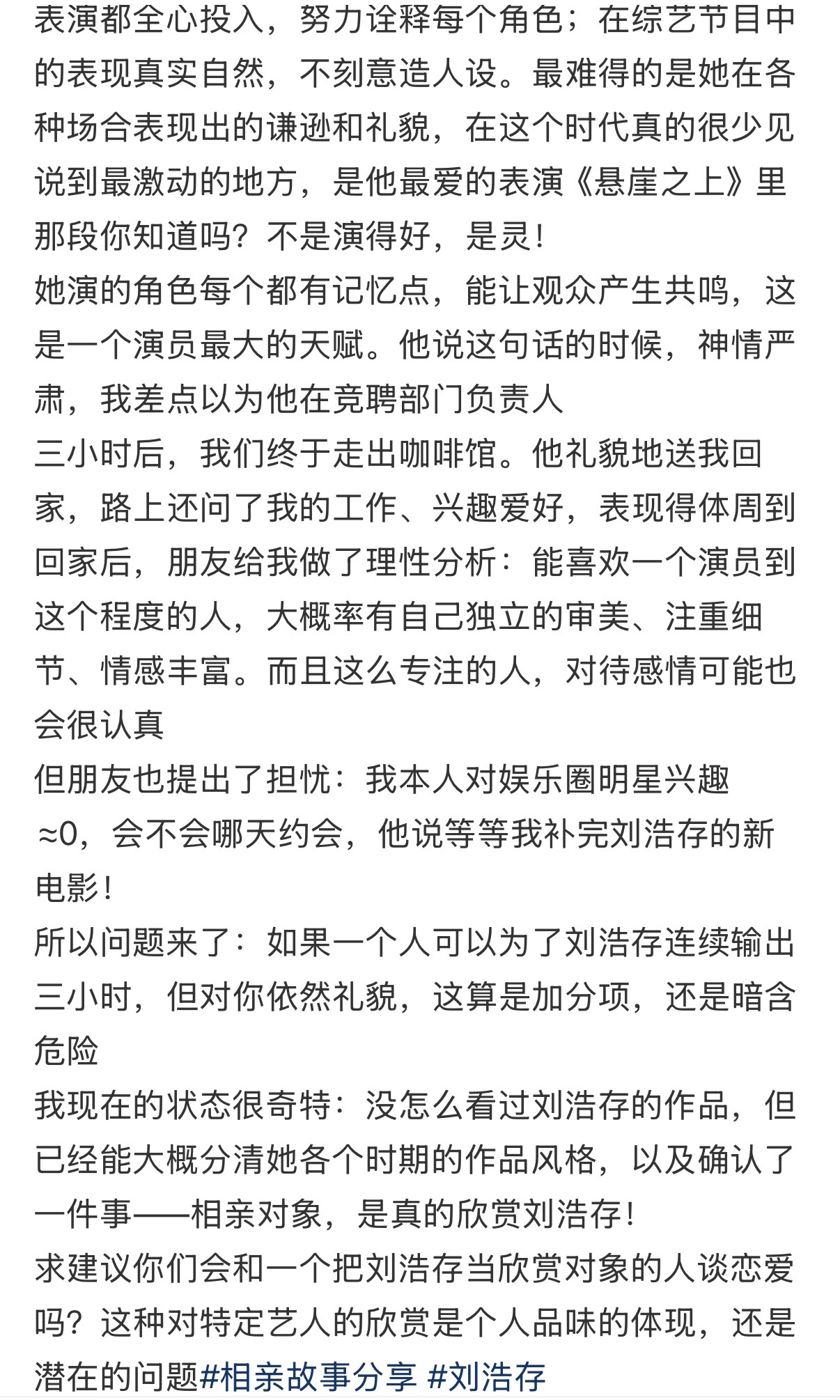 刘浩存 一女生去相亲反被对方安利了三个小时刘浩存,网友本以为只会聊五分钟,结果对方从刘浩存早期学舞蹈的故事一路讲到现在网友辣评:你是相到张艺谋了吗不过刘浩存这么优秀,爱上她也是人之常情吧!可以看得出来男方是真的欣赏存子!去相亲被安利三小时刘浩存