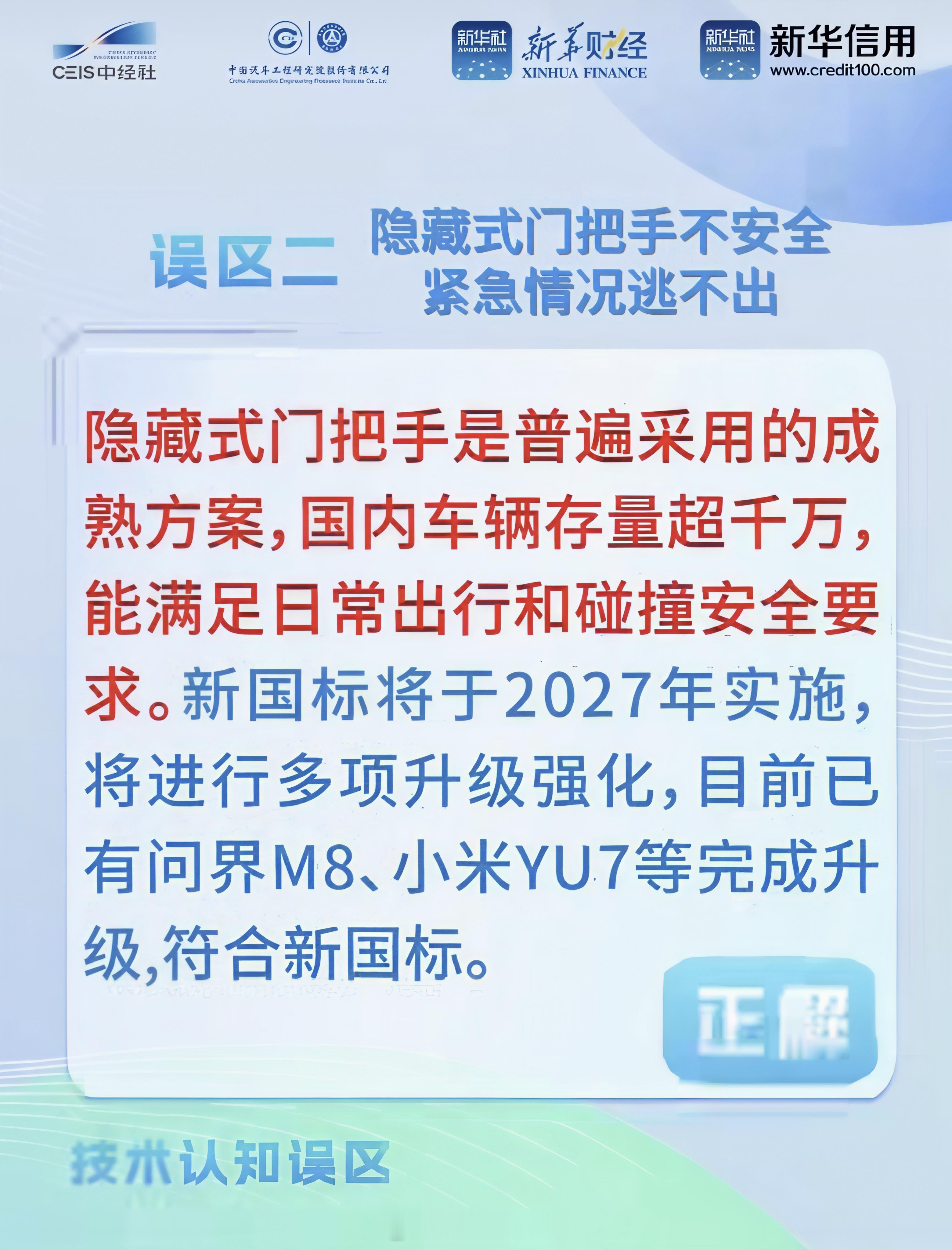 新华财经和中汽研联合发出的这份报告真的值得一看,澄清了关于新能源汽车的9大安全误区,我挑几个大家一定会感兴趣的来聊一聊:①隐藏式门把手≠不安全隐藏式门把手普遍采用的已经成熟的方案,目前国内配置隐藏式门把手的车辆已经超 1000万辆,就光特斯拉一家在国内卖出配备隐藏式门把手的车型就远超300万辆了汽车隐藏式门把手存量超千万 大部分人都是被网上的个例吓到了,才会觉得隐藏式门把手一定不安全,而且2027年也会执行新国标,目前小米YU7和问界M8等车型已经提前满足了新国标②碰撞测试好≠怎么开都安全其实理性一点的朋友都知道,碰撞测试只能保证在一定条件下车辆是安全的,但是路上的车祸随机性太强了,测试好不代表就一定安全澄清9大新能源车安全误区只有严格按照交规行驶,才能减少出车祸的概率③辅助驾驶≠自动驾驶在目前阶段,无论辅助驾驶多么智能,永远都只是辅助,驾驶员依旧是第一责任人,那些用辅助驾驶一出事就找车企的明显是没弄明白责任的划分还有车企在宣传的时候也一定要严格把控,不能夸大宣传,辅助就是辅助,辅助不是自动,开车就睡觉更是不能有的想法