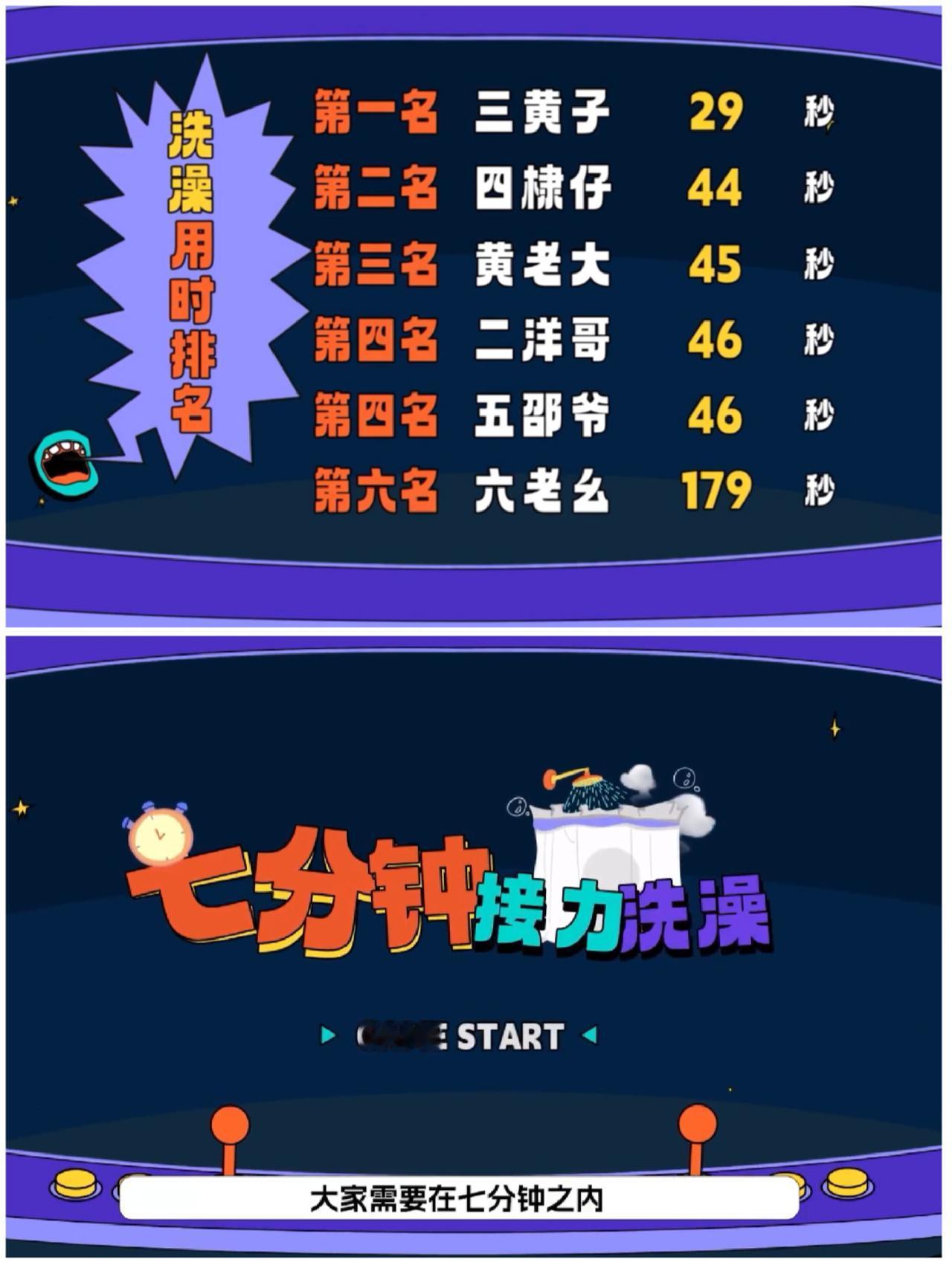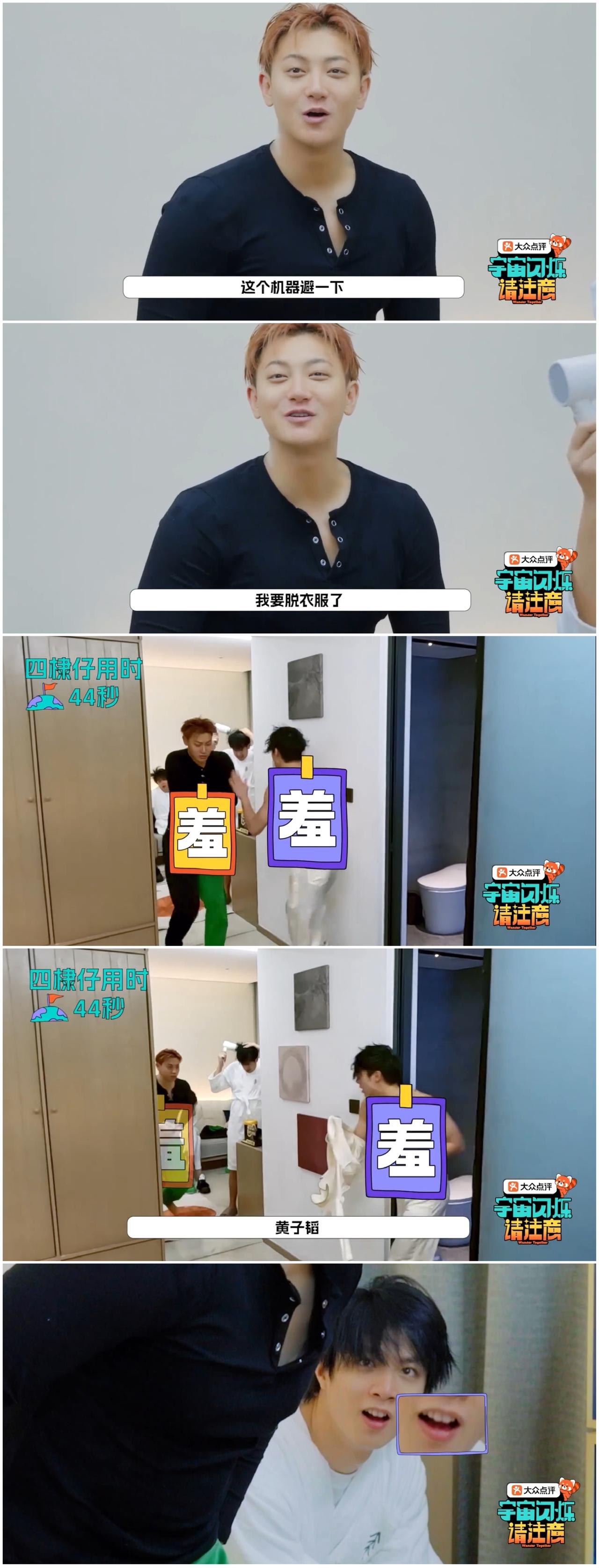 王鹤棣挑衅节目组, 大喊这能播吗? 到底把他们逼成啥样了。 节目组安排黄晓明他们 七分钟接力洗澡限时挑战, 扬言时间一到, 就算没有完成洗澡穿衣, 摄像大哥就冲进浴室去拍摄。 王鹤棣听到这样的“狂言”, 质疑这些内容能播吗? 接下来, 刘耀文强调自己很快的, 结果他用时最长, 理由是里面的秋裤很难脱。 而其他人则尽量压缩时间, 可能就把头发和身体弄湿了, 就出来了, 黄子韬还打算 在外面把衣服脱好了, 直接进去洗澡。 而王鹤棣也许觉得自己身材好, 就穿了裤子, 露着上半身就出来了。 其他兄弟都是穿着浴袍出来的, 一点都不让镜头拍到。 可能身材没有锻炼好。 你说这个节目组是不是有病呀, 这个7个人完全可以把身上弄湿就出来, 完全可以轻轻松松赢得比赛呀。 又不是非得在里面洗澡。 人家不会回到房间各自再一次洗澡吗? 难道节目组想拍嘉宾走光 还是想拍嘉宾洗澡时的好身材, 就像电视剧里男主洗澡秀肌肉那样呢? 就为了引起无限遐想吗?