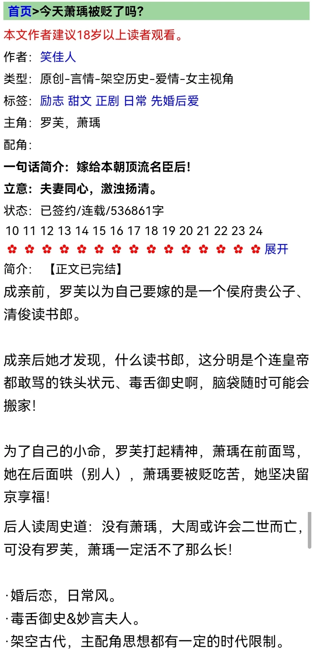 貌美嘴甜小村姑vs毒舌直男状元郎,温暖日常风,唐朝背景。男主是唐朝初期六起六落的宰相萧瑀,爱情亲情君臣之情都刻画的不错。女主罗芙虽是村姑,但肤白貌美小太阳性格,一场娃娃亲阴差阳错让二人成了婚,在外怼天怼地的男主对她一见钟情无法克制,还是个护妻狂魔,小夫妻相处日常甜得冒泡。但男主性格太过刚正不阿,萧瑀一张嘴在前面飞,罗芙拼命在后面圆。历经三代皇帝跨越中老年,但一点都不枯燥。姐夫和姐姐这一对副cp也很好看点。