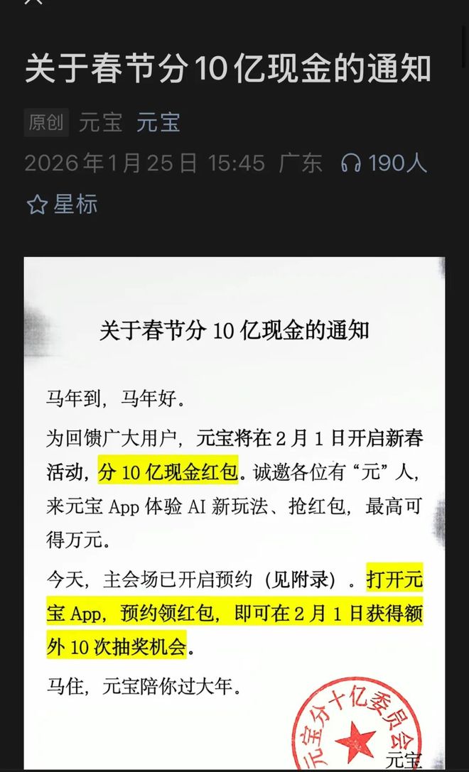 为了推动这个形态的普及,腾讯甚至宣布将在春节期间投入10亿现金红包。这在近年来的互联网营销中已不多见,用真金白银结合强社交裂变,元宝尝试快速推动用户完成从「单机AI」到「社交AI」的习惯迁移。
