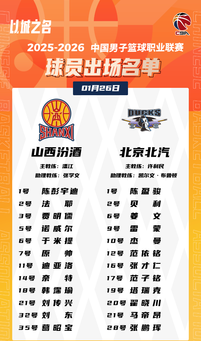 虎扑01月26日讯今日CBA常规赛,北京对阵山西的大名单已经公布。