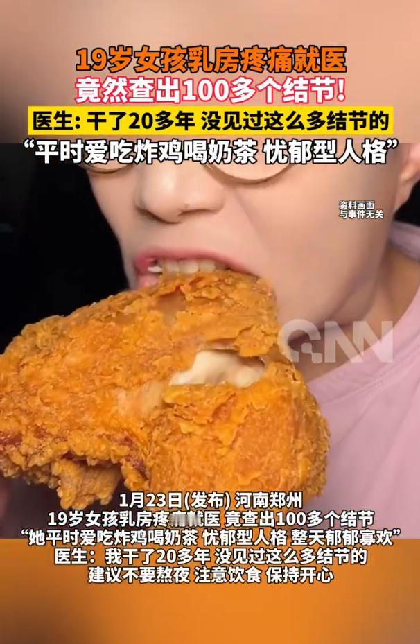 “悲剧还是发生了!”近日,河南,一女子性格内向,每次和人说话都容易焦虑,平时还喜欢点外卖吃零食,结果最近,她感觉自己的胸口非常疼,一摸还有肿块,去医院检查时,医生发现女孩乳腺竟有100多个结节!医生:干几十年也没见过这阵仗! 女孩性格内向敏感,与人相处时总容易焦虑,凡事都想着迁就别人,平时还总点外卖、吃零食,饮食毫无规律,直到最近胸口传来难忍的疼痛,触摸时还摸到明显肿块,她才被迫就医,结果检查后医生都惊呆了,女孩的乳腺里,竟然长了100多个结节,连行医几十年的资深医生都直言,从没见过这阵仗! 当女孩的乳腺影像片子挂在观片灯上时,诊室里的空气瞬间凝固了,片子上没有零星的阴影,取而代之的是密密麻麻、铺天盖地的斑点,布满了年轻的乳腺组织。 站在灯前的医生,在这一行摸爬滚打了几十年,见过无数重症病例,什么样的复杂病情都应对过,可此刻看着片子,还是不由得倒吸一口凉气,这画面带来的视觉冲击太过强烈,很难将它和眼前这个身形稚嫩、满脸局促的19岁女孩联系起来。 坐在问诊凳上的女孩,正值人生最美好的青春年华,性格却格外内向文静,甚至带着几分讨好型人格的怯懦,在与人相处时,她总是极度在意别人的感受,哪怕自己心里不舒服,也不敢轻易拒绝别人,更不会把负面情绪说出口,生怕自己的一句话、一个举动惹得对方不快。 每次与人沟通后,内心都会陷入长时间的焦虑,这些憋在心里的委屈、没说出口的拒绝,全都被她悄悄藏了起来。 除了长期的情绪内耗,不健康的饮食习惯,也成了摧毁她身体防线的重要推手,在女孩的日常里,外卖、奶茶和各类零食占据了饮食的主导,高糖高油的食物成了常态。 心情不好时她就点杯奶茶缓解情绪,学习生活压力大了,就靠重油外卖和零食麻痹自己,三餐规律早就被抛到了九霄云外,对她而言这些食物不仅是果腹的东西,更是廉价又便捷的“精神慰藉”,却不知早已在悄悄透支着身体。 其实身体早就给过她预警信号。最初只是胸口隐隐作痛,偶尔触摸时能感觉到硬块,若是换成旁人,或许早就第一时间就医检查了,可这个女孩却选择了硬扛,她习惯了忍耐既怕麻烦别人,也怕查出问题让家人担心,就这么一天天拖着,任由疼痛不断加剧,直到后来疼痛升级成尖锐的穿刺感,疼得她连腰都直不起来,甚至濒临生理极限的崩溃,她才终于忍不住告诉家人,被带着去了医院。 冰冷的医学探头划过皮肤时,医生原本推测可能只是普通的乳腺增生,可指尖传来的触感却异常坚硬,且肿块分布密集,和预想中的情况完全不符,初步判断情况并不乐观。后续的检查结果,也印证了医生的担忧,乳腺内竟密密麻麻长了100多个结节,数量之多超出了所有人的预期。 为了排查病因,医生特意做了遗传因素检测,结果显示这并非基因导致的问题,这个结论其实比遗传因素更让人揪心,意味着这满胸膛的结节,完全是后天因素造成的,是长期的情绪压抑与劣质饮食习惯联手,对这具年轻躯体发起的一场无声围剿。 很多年轻人都觉得,年轻就是最大的资本,身体可以随意透支,就像一张永远刷不爆的信用卡,肆意挥霍也无所谓,可这个19岁女孩的案例,用一种惨烈的方式告诉我们,身体的记性远比我们想象中要好,它记得你每一次忍气吞声的委屈,记得你每一次熬夜吃的高油外卖,记得你每一次用甜食麻痹自己的焦虑,所有的亏欠,最终都会以疾病的形式找上门来。 对于和女孩一样性格内向、心思细腻的人来说,保护乳腺、守护健康的第一步,或许不是盲目吃保健品,而是学会“翻脸”,学会拒绝,在这个充满焦虑的时代,我们都需要一点“被讨厌的勇气”,不用一味迎合别人,不用勉强自己咽下所有委屈,试着把心里的想法说出来,拒绝那些让自己不舒服的要求,给情绪找一个出口。 (信息来源:《19岁少女乳房疼痛,医院一检查竟然有100多个结节,医生:工作26年,没见过这么多结节》红星新闻)