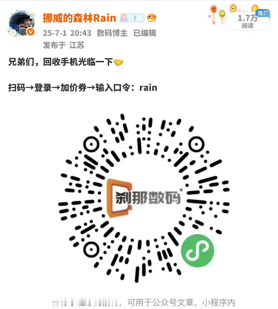 年底需要换新的朋友们,不如把旧机置换,换笔钱补贴一下支出到年底了,刹那这边的回收机型价格也都更新了,价格较其他回收平台还是很良心的,大家不妨可以试一试,这边不容易扯皮方式依旧如下微信扫码打开小程序,登录之后在我的页面输入口令:rain,领个加价券,然后截图去加微信,就可以按操作置换