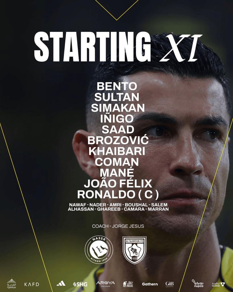 利雅得胜利首发:24-本托、2-加奈姆、26-伊尼戈-马丁内斯、3-西马坎、96-萨阿德-纳赛尔、10-马内、11-布罗佐维奇、17-阿卜杜拉-海巴里、21-金斯利-科曼、7-C罗、79-菲利克斯