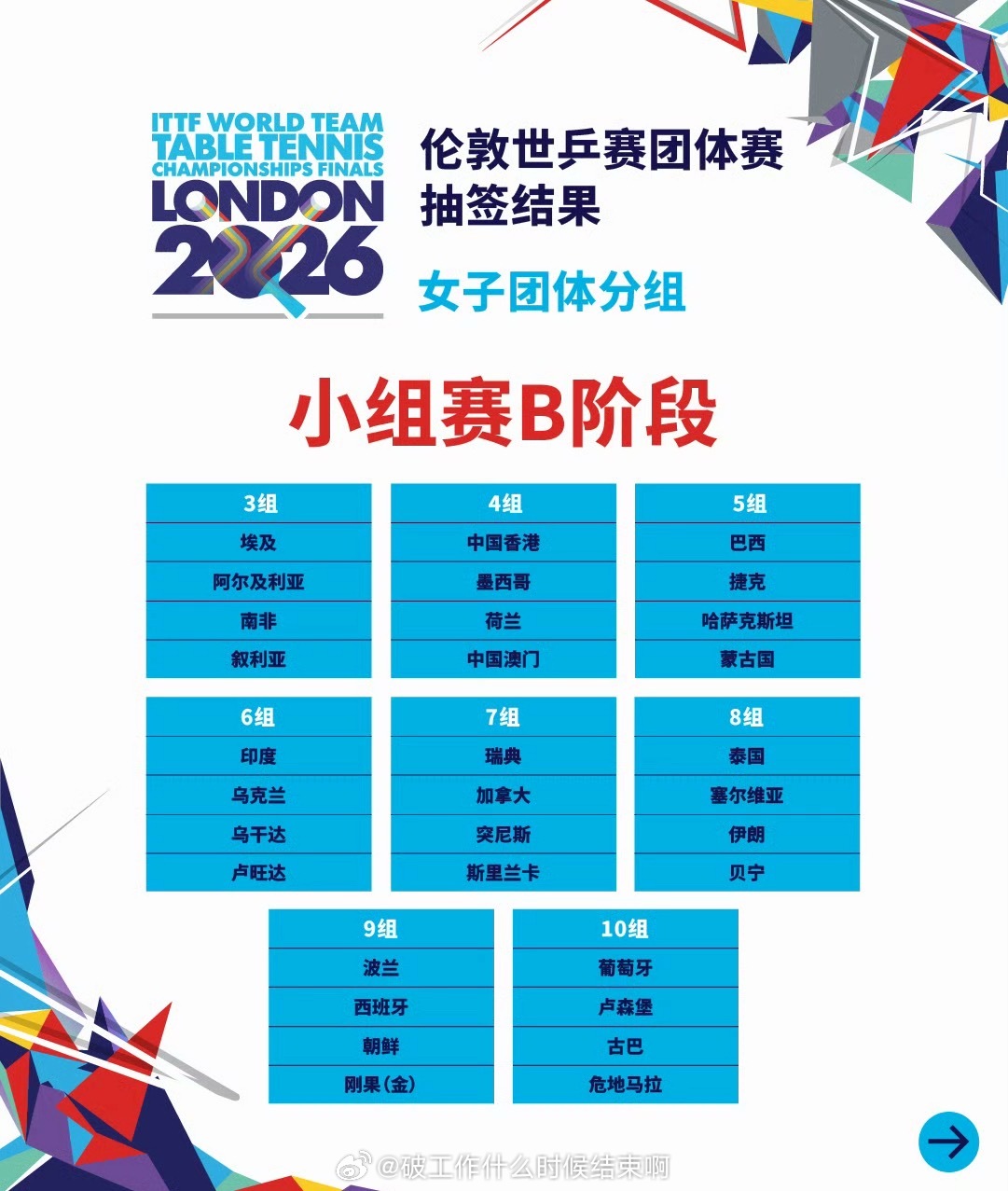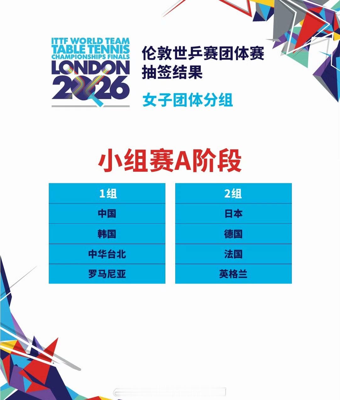 📢伦敦世乒赛分组抽签出炉🇨🇳国乒女团、🇰🇷韩国、中国台北、🇷🇴罗马
