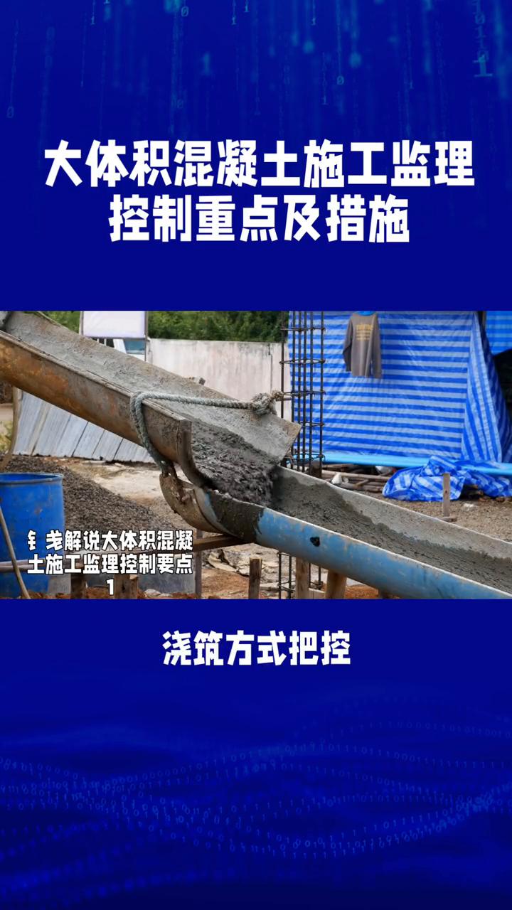 ant:大体积混凝土施工监理控制重点及措施。 钅解说。 大体积混凝土施工监理控制重点及措施。大体积混凝土监理核心是控制裂缝产生,围绕温控、水化热、浇筑、养护、质量验收五大核心全过程把控。具体重点及措施如下: ·一、施工准备阶段监理控制: →1、控制重点:图纸会审、方案审查、材料质量、人员设备交底。 →2、关键措施:审核施工组织设计,重点审查温控方案、浇筑方案、养护方案、应急措施、材料质量把控。 水泥优先选低热矿渣水泥,石子采用连续级配,掺加高效缓凝剂、粉煤灰,严格检测配合比。人员设备验收,核查施工队伍资质、特种作业人员证书,验收搅拌站、输送泵、测温设备是否到位。技术交底监督,确保施工方对班组交底到位,明确温控、浇筑、养护要求。 ·二、浇筑过程监理控制: →1、控制重点:浇筑顺序、分层厚度、振捣质量、入模温度。 →2、关键措施:入模温度控制,夏季降温,冬季保温,入模温度≤30°C、≥5°C。 浇筑方式把控:采用分层推移、斜面分层浇筑,分层厚度≤500mm,相邻层浇筑间隔≤混凝土初凝时间。振捣质量监督:采用插入式振捣器,振捣至表面泛浆无气泡,避免漏振、过振。振捣棒插入下层50mm,现场配合比监控,严禁随意加水,抽查坍落度,每工作班至少2次,偏差≤+20mm。 ·三、温控与测温监理控制: →1、控制重点:内外温差、降温速率、测温频率。 →2、关键措施:测温方案执行,按设计布点,浇筑完成后1-7d每2h测1次,8-14d每4h测1次,记录完整数据。 温差控制措施:当内外温差>20°C时,及时覆盖保温,必要时采用内部通水冷却,控制降温速率≤2°C/d。应急处理:若温差超标,立即要求施工方调整保温措施,增加测温频次,分析原因并整改。