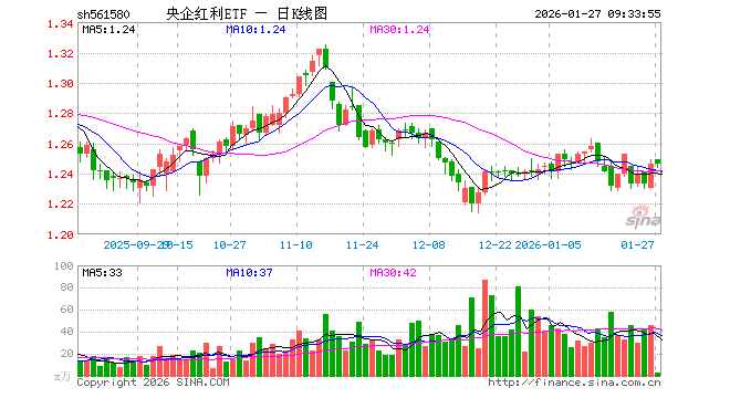 1月27日,央企红利ETF(561580)开盘涨0.24%,报1.249元。央企红利ETF(561580)重仓股方面,中远海控开盘涨0.07%,中国神华涨0.02%,中粮糖业跌0.47%,中国石油涨0.00%,中国石化涨0.16%,中国海油跌0.45%,南钢股份跌0.35%,交通银行涨0.15%,光大银行涨0.00%,工商银行涨0.00%。
