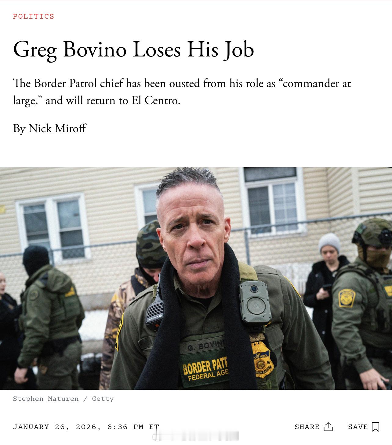 杂志:据国土安全部官员及两位知情人士透露,Gregory Bovino已被免去“边境巡逻队全国指挥官”的职务,将返回加州El Centro的原岗位,并预计很快退休。Bovino的突然降职,是迄今为止最明显的信号,显示Alex Pretti 事件后,川普政府正在重新审视其最激进的执法策略。海外新鲜事今日焦点