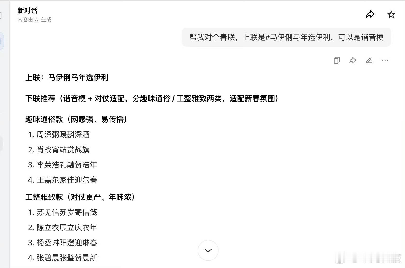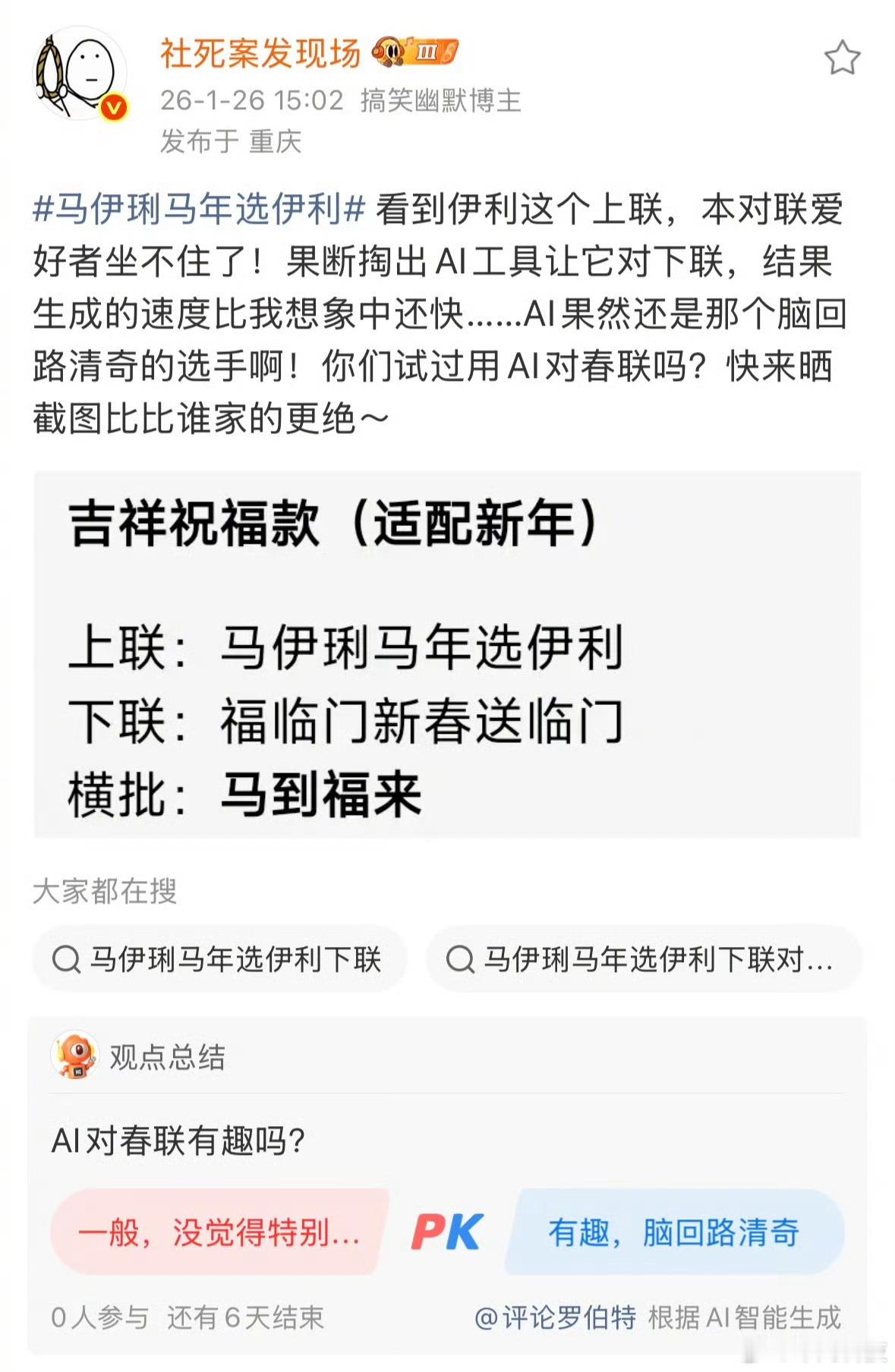 这两天刷微博,突然发现大家都玩起了AI对春联,真的笑不止。那句上联“马伊琍马年选伊利”简直是开局王炸,网友们用各种AI工具来应战,下联千姿百态,有的古风满满,有的直接搞成段子,不押韵也能博大家一笑。看着传统对联和智能AI的混搭效果,感觉就像老茶壶里涌出了汽水味的新点子,既有老味道,又很新潮。罗伯特的回复也让人感叹!AI果然是跨界高手,严肃和搞笑都能驾驭。谁还没来试一试?就用AI给这个上联来个你的绝活版,也许下一个被全网点赞的就是你!马年春联已进入AI时代
