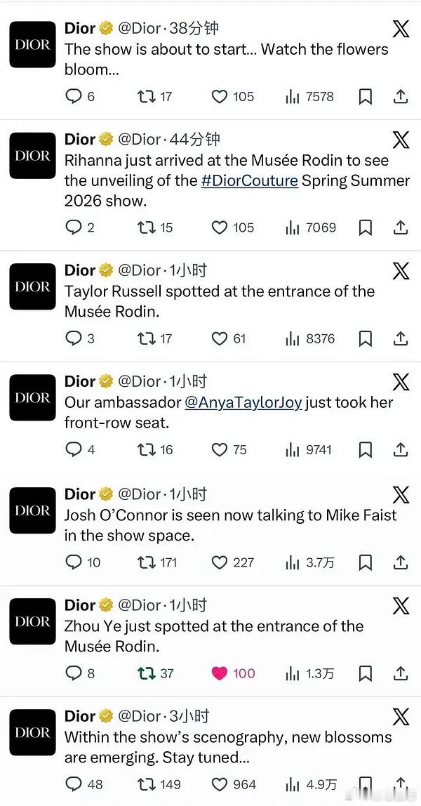周也是Dior此次高定秀全球首位转发这个待遇怎么样,推特也只发了五个艺人唯独包括