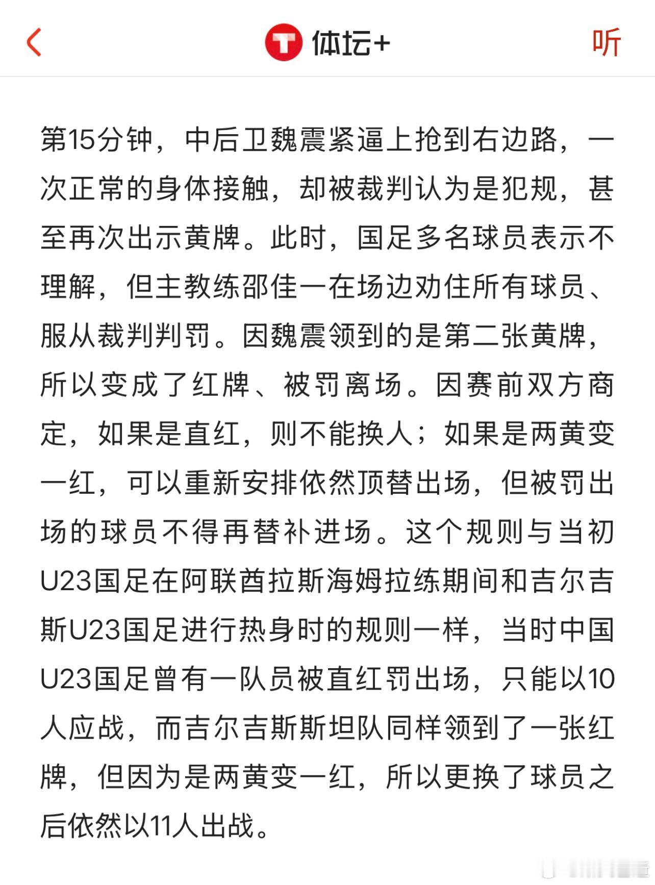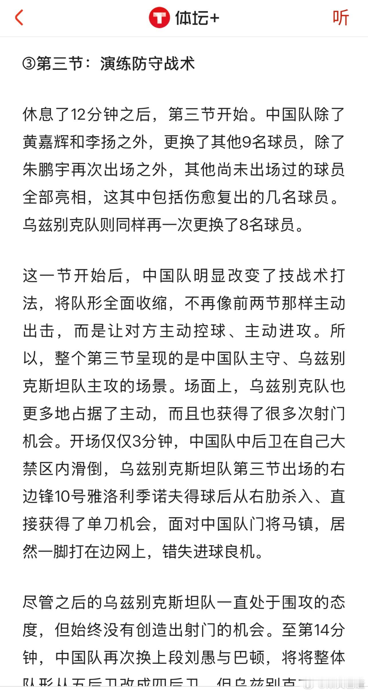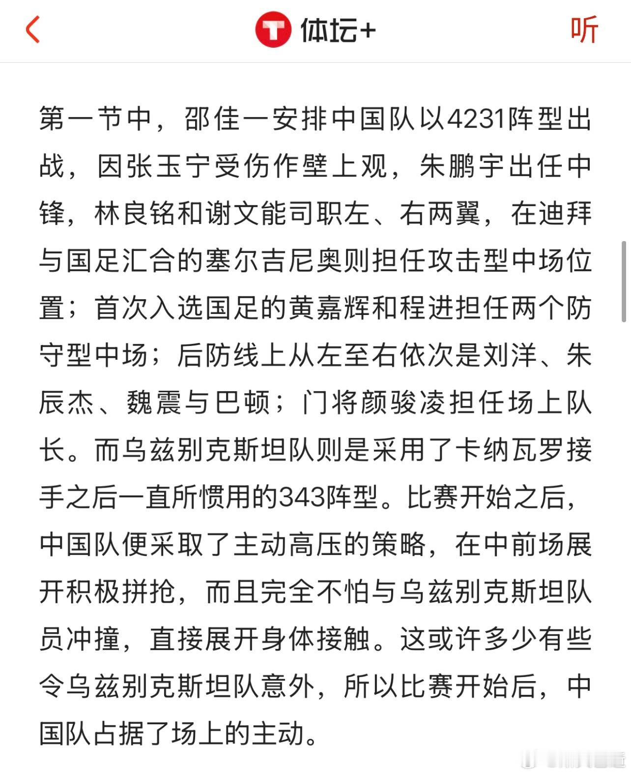 国足热身赛2比2乌兹别克斯坦 体坛周报前方报道的一些细节:首发4231,巴顿右后卫,黄嘉辉踢得时间不短。这个体系和邵佳一在西海岸相似,防守时应该会变为平行442。同样,邵佳一把俱乐部时期的压迫和转换带到国足,第二个进球就是来自于此。魏震第二节吃到第二黄,因为双方约定,直红不能补人,但两黄一红可以补人,所以李扬替了他,依旧11打11。第三节大轮换,主要防守为主,还切换了阵型。