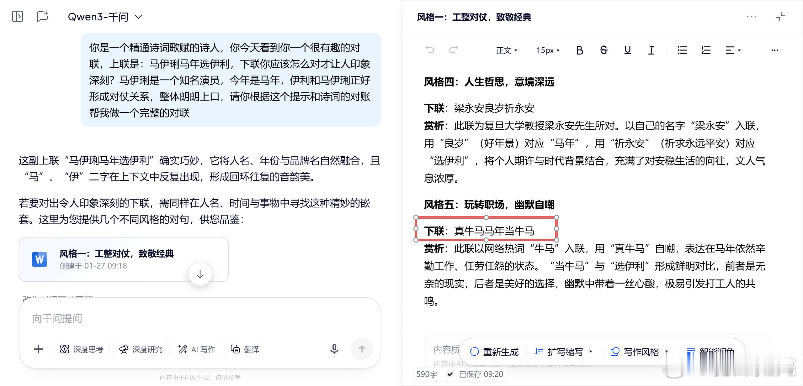 马年春联已进入AI时代 “马伊琍马年选伊利”伊利出的这个上联也算是给AI的一个自然语言处理边缘测试题了。看了一眼各路网友晒的AI 对下联,可以说现在AI对中文的理解能力是真的强,基本没有翻车的,都写的不错。特别是那个“真牛马马年当牛马”,对的是真的牛据说你也会对下联?快来我这评论一下,看看你的水平如何。