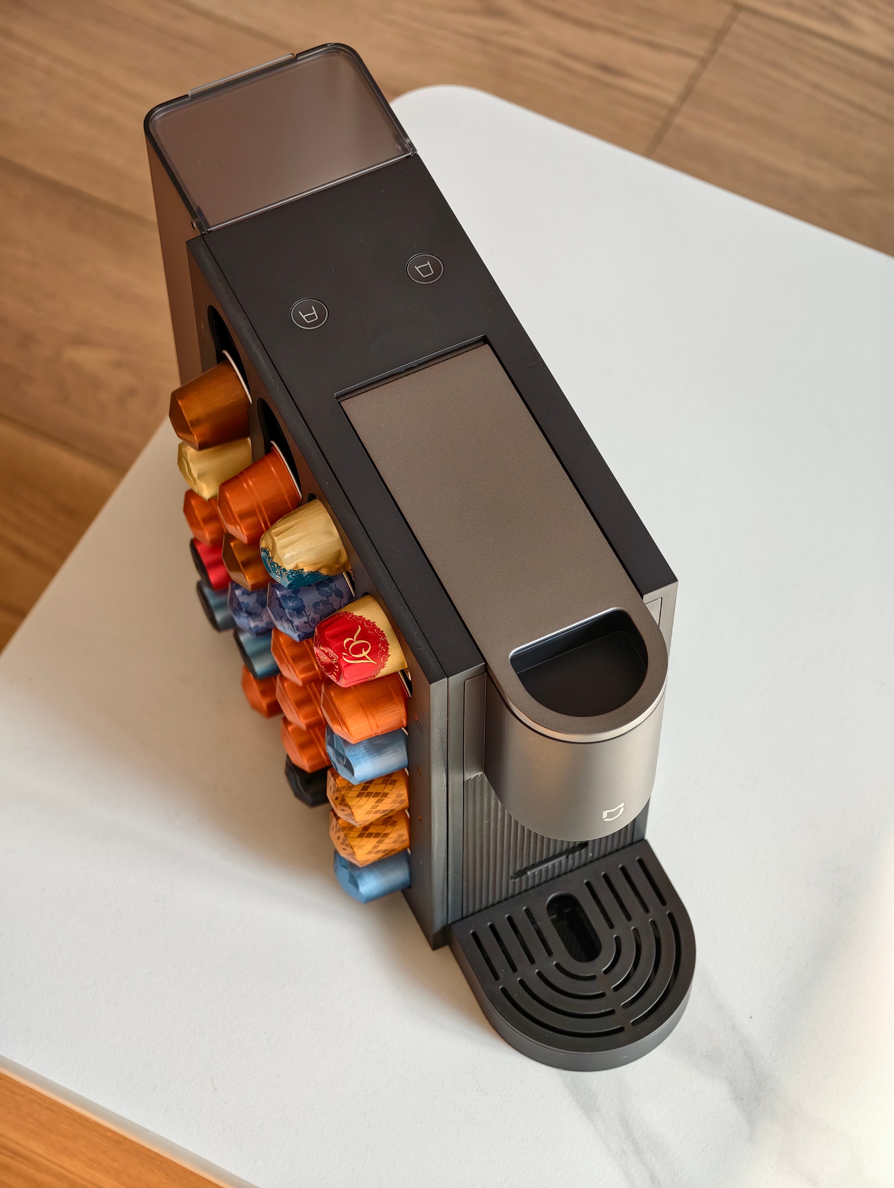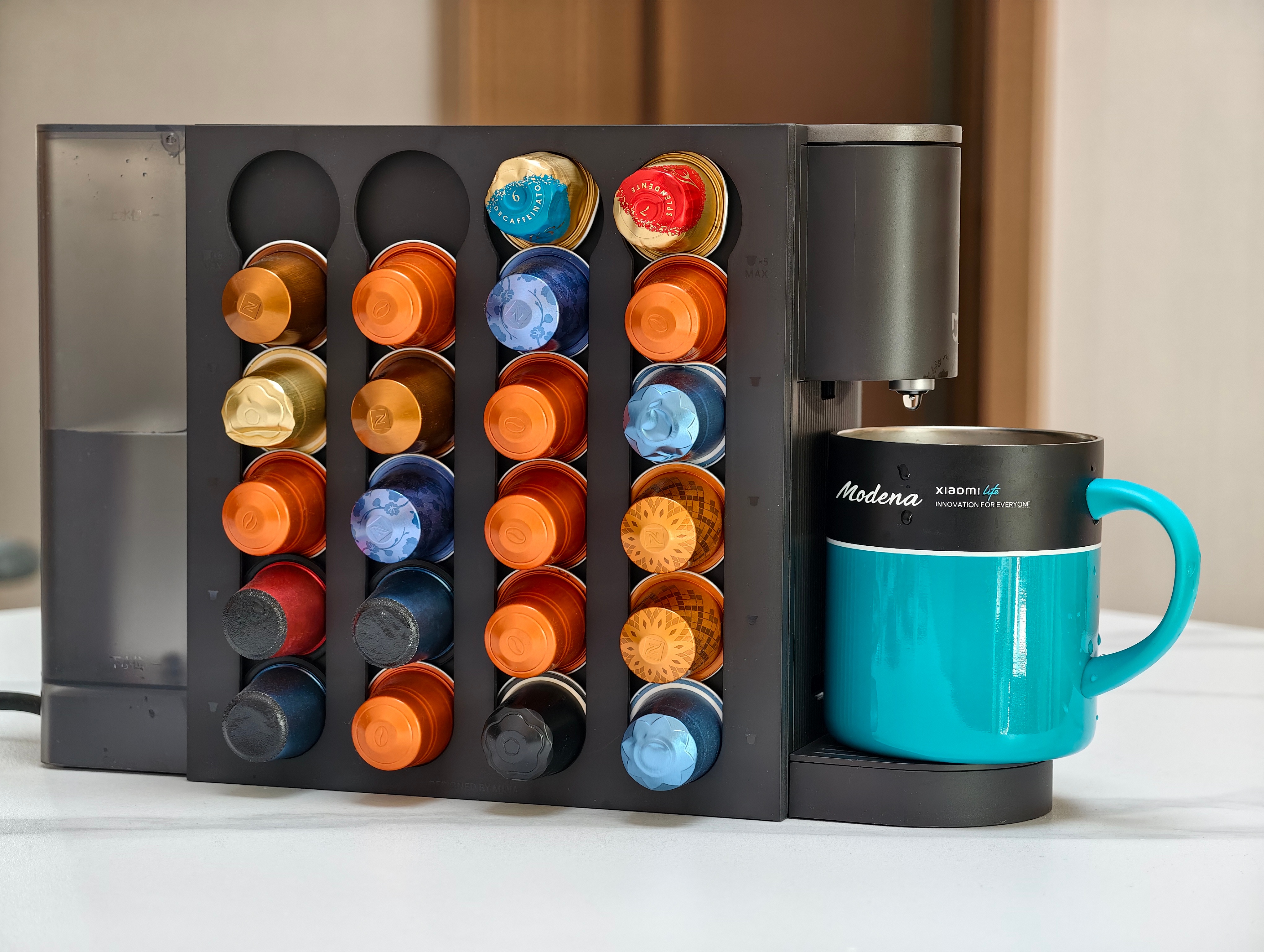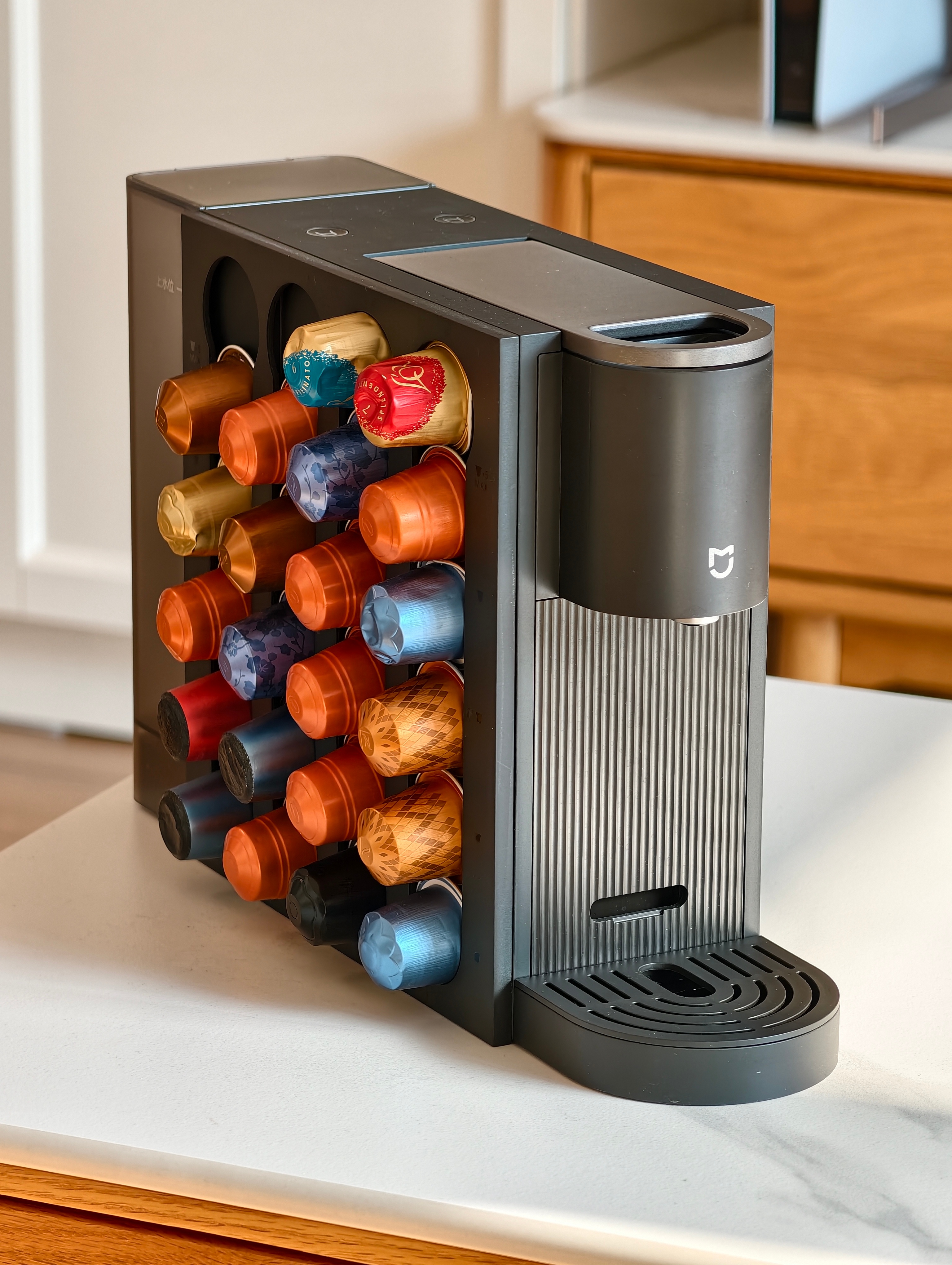 我喝咖啡不多 有个原因是怕麻烦买得等 磨的时间长 然后我入了米家胶囊咖啡机S1 因为老出差有的时候酒店会有咖啡胶囊 直接带回来 米家的也能用 磁吸胶囊挂架上都是我打猎回来的 胶囊萃完直接扔垃圾桶就行小米自己的胶囊口味也不错还不贵比我琢磨选豆省事多了正好过年了 家里年轻人喜欢喝咖啡送他们了 其实出去露营 价格美丽送朋友 同事也不错