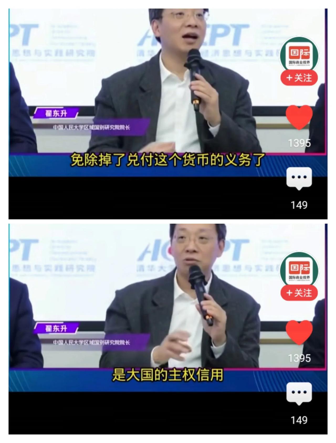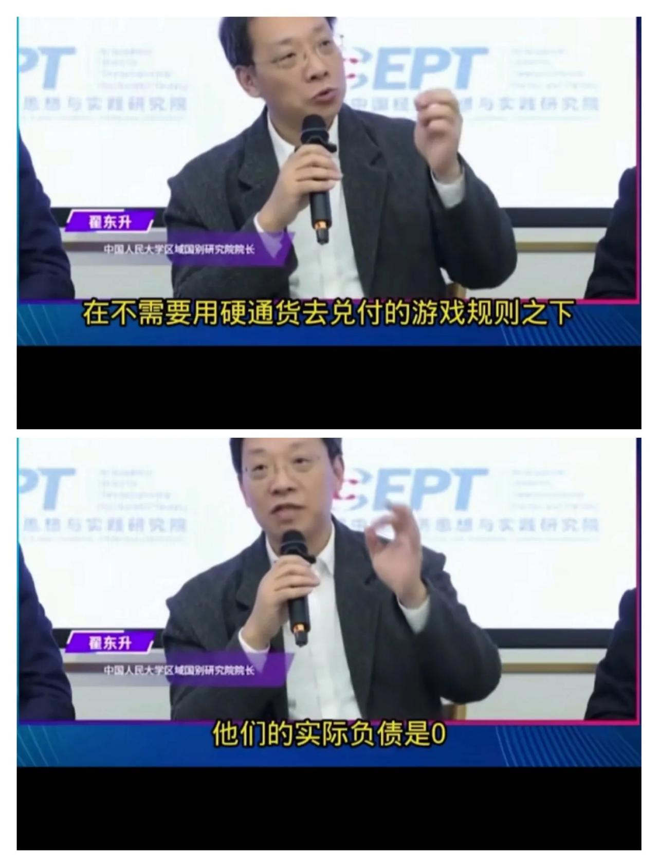 翟东升教授精辟讲解美国国债和货币主权信用(某些内容是笔者补充) *格林斯潘在国会说‘’美国国债根本不用偿还!‘’ *古代世界各国普遍用金属制造货币。 英镑当年是银本位制度,发行的纸币英镑随时可以兑换白银。 二战后的‘布雷顿森林体系’规定美元与黄金挂钩,一盎司(31.25克)黄金价值35美元。各国随时可以用美元向美国兑换黄金。 *因为石油危机和财政危机,1971年美国政府宣布美元与黄金脱钩,各国不能以固定比率、用美元向美国政府兑换黄金! *此后货币的发行逻辑就发生了天翻地覆的改变! 国家发行货币不再以金银储备作为前提条件,而是以所谓的主权信用作为价值保证。 *这样一来,美国发行国债和美元,就根本不用承担刚性兑付的责任和义务,它不需要用黄金白银来偿还,也不需要用其他的珍稀资源来偿还。 美国可以肆无忌惮地随心所欲地印刷纸币美元来偿还! 这就意味着,哪怕美国欠了无穷无尽的债,但是实际上美国的负债永远等于零! 这就是美国霸权和美元信用的真实面目!
