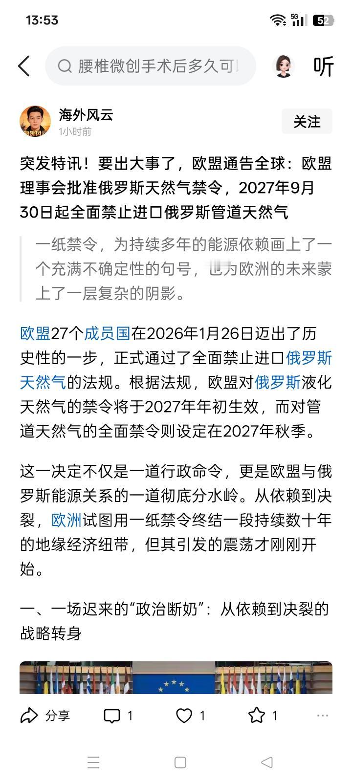 绞绳再紧一点? 从目前的国际社会的形势上看,欧盟无疑是帮助乌克兰抵抗俄罗斯特别军事行动中最重要的、无出其右的力量。然而,直到本月的26日,欧盟理事会才正式批准欧盟委员会,关于未来全面禁止使用俄罗斯天然气的决定。该决定在2027年的年初生效,对于利用管道购买俄罗斯天然气的,可以延长到2027年的秋季。据有消息说,如果有国家违反欧盟的规定,将罚收入的3.5%。 这实际上就是说,天然气这条似乎绞索的绳子,欧盟现在基本上拉紧到了极致。欧洲除了加入欧盟的国家之外,其它的大部分国家,大概不是在争取加入欧盟的路上,估计就是在准备申请加入欧盟的过程中。 从目前可见的信息来看,如果乌克兰的战争继续持续下去,影响最大的、最不利和受损最大的好像是俄罗斯。当然,也有一些人抱着与此完全相反的观点,认为俄罗斯最终会取得胜利。但实际上,即便是拣好的说,俄罗斯在战场取得了胜利,战场上的胜利并不等于国家在全方面的胜利。伊拉克的萨达姆就在科威特取得了胜利,最后结果是个什么,想毕大家都知道。 国际上天然气销售渠道一旦被完全、或者大部分被切断,如果再要重新建立起来,估计一定要付出额外的代价。