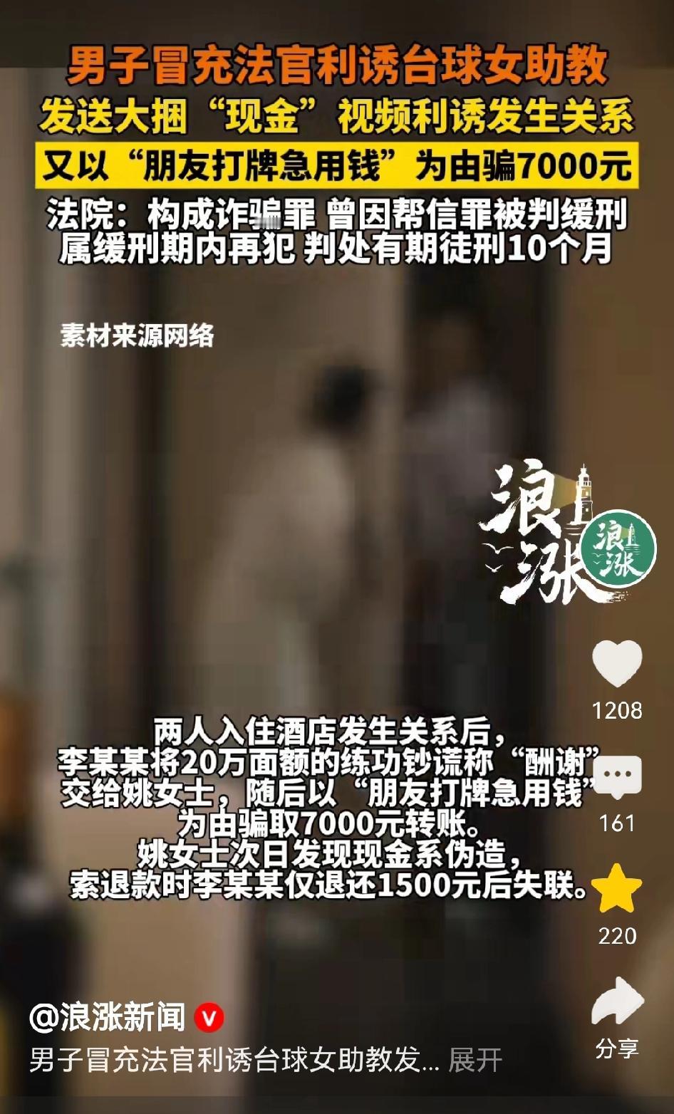 湖北,一男子在网上认识了台球女助教,于是,男子告诉女助教自己是公务员,如果对方愿意出来玩,就给对方15万,如果到酒店开房就给10万,女助教心动不已当即和男子开了房,完事后,男子将20万现金交给了对方,随后又向女子借走了7000元,等男子离开后,女子仔细核验这笔钱时直接傻了眼,这竟然全部都是练功券。 湖北荆州沙市区,一名正在缓刑期的男子,靠着一捆银行练功券,上演了一出冒充公职人员骗色骗财的戏码。   这名男子姓李,2024年6月因帮信罪被法院判处有期徒刑6个月,同时宣告缓刑一年,本应安分改造的他,却在缓刑期间动了歪心思。   2025年3月,李某加入了当地一家台球厅的会员微信群,在群里翻看联系人时,注意到了台球助教姚女士。   姚女士平时靠接待到店客人、提供助教服务赚钱,为了完成业绩,也会主动通过微信对接群里的潜在客户,所以当李某发来好友申请时,她没多想就通过了。   添加好友后,李某没有提去台球厅消费的事,反而很快开启了“炫富模式”。   他给姚女士发了一段视频,画面里是他车内堆着的几大捆“现金”,紧接着就谎称自己是当地法院执行局的法官,手里不仅有权,还经营着多家企业,根本不缺钱。   几句花言巧语铺垫后,李某直接抛出了金钱诱饵,明确告诉姚女士,只要愿意陪他单独待两个小时,就给15万,要是能一起去酒店,再额外给10万,还说钱可以先兑现。   高额报酬让姚女士动了心,她特意留意了李某的朋友圈动态,又简单打听了几句,觉得对方的“法官身份”和“经济实力”都可信,慢慢放下了所有防备,答应了李某的邀约。   当天晚上,两人约好碰面后,一同前往沙市区的一家连锁酒店。   到了酒店前台,李某突然停下脚步,以公职人员开房会留下记录、影响工作为由,让姚女士用她自己的身份证办理入住手续。   姚女士当时满脑子都是约定好的报酬,没察觉任何异常,乖乖用自己的身份开了房,随后两人在房间内发生了关系。   等到凌晨时分,两人从酒店出来回到李某的车上,李某从后备厢拿出一捆用塑封袋包好的“现金”,递到姚女士手里,说这里面是20万,算是提前兑现的报酬,让她收好。   姚女士接过沉甸甸的“现金”,心里十分高兴,对李某更是深信不疑。   没等姚女士下车,李某突然说自己等下要和朋友打牌,但是微信里没有零钱,想先跟她借7000元,等改天就还。   想着自己刚拿到20万,姚女士觉得借7000元不算什么,生怕得罪对方影响后续,当场就通过微信把钱转给了李某。   等李某开车离开,姚女士回到家迫不及待地拆开塑封袋,准备清点这笔“巨款”时,才发现里面的钱根本不是真钞,全是银行用来训练员工点钞的练功券,上面还印着“练功专用”的字样。   姚女士又气又急,立刻给李某发微信、打电话,要求对方退还7000元钱。   李某只勉强退还了1500元,之后就拉黑了姚女士的联系方式,彻底消失在了她的视线里。   走投无路的姚女士,最终选择报警求助,警方很快将李某抓获,也查清了他的全部犯罪事实。   李某的行为早已触碰法律红线,他冒充法院法官这一国家机关工作人员身份,本身就涉嫌招 摇撞骗,再用练功券冒充真钞诱导姚女士借钱,主观上没有还钱意愿,属于典型的诈骗行为。   更严重的是,他此次犯罪发生在缓刑考验期内,违反了缓刑的监管规定,依法必须撤销缓刑,对前后两罪合并处罚。   最后,法院结合各种情况,最终以诈骗罪判处李某有期徒刑10个月,撤销此前的缓刑,两罪并罚后,执行有期徒刑10个月。   现实中,冒充公职人员诈骗的案件屡见不鲜,这类骗局之所以容易得手,就是因为公职人员身份自带公信力。   不法分子往往搭配炫富、高额利诱等手段,抓住部分人贪图利益的心理,一步步诱导受害者落入陷阱。   对李某的惩处,既是对其犯罪行为的制裁,也给所有缓刑人员敲响了警钟。   缓刑不是免责的“保护伞”,而是改过自新的机会,一旦在缓刑期内再犯新罪,只会面临更严厉的法律制裁。