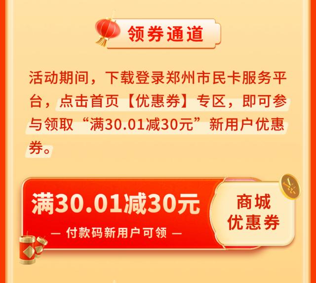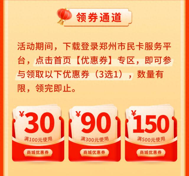 自1月28日起至2月1日,每天上午10点,郑州社保卡(市民卡)用户(含省直)可通过郑州市民卡APP领取优惠券,包括“满500减150元”“满300减90元”“满100减30元”三档面值,每人限领1张(三选一)。成功领券后,在市民卡商城线上购物即可享受相应满减优惠。