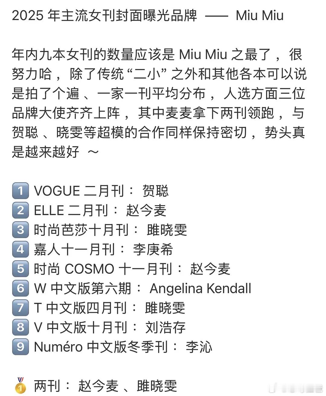 2025年赵今麦是miumiu推封最多的艺人,且都是五大,还有一封马来西亚时装,这待遇确实是中miu1了
