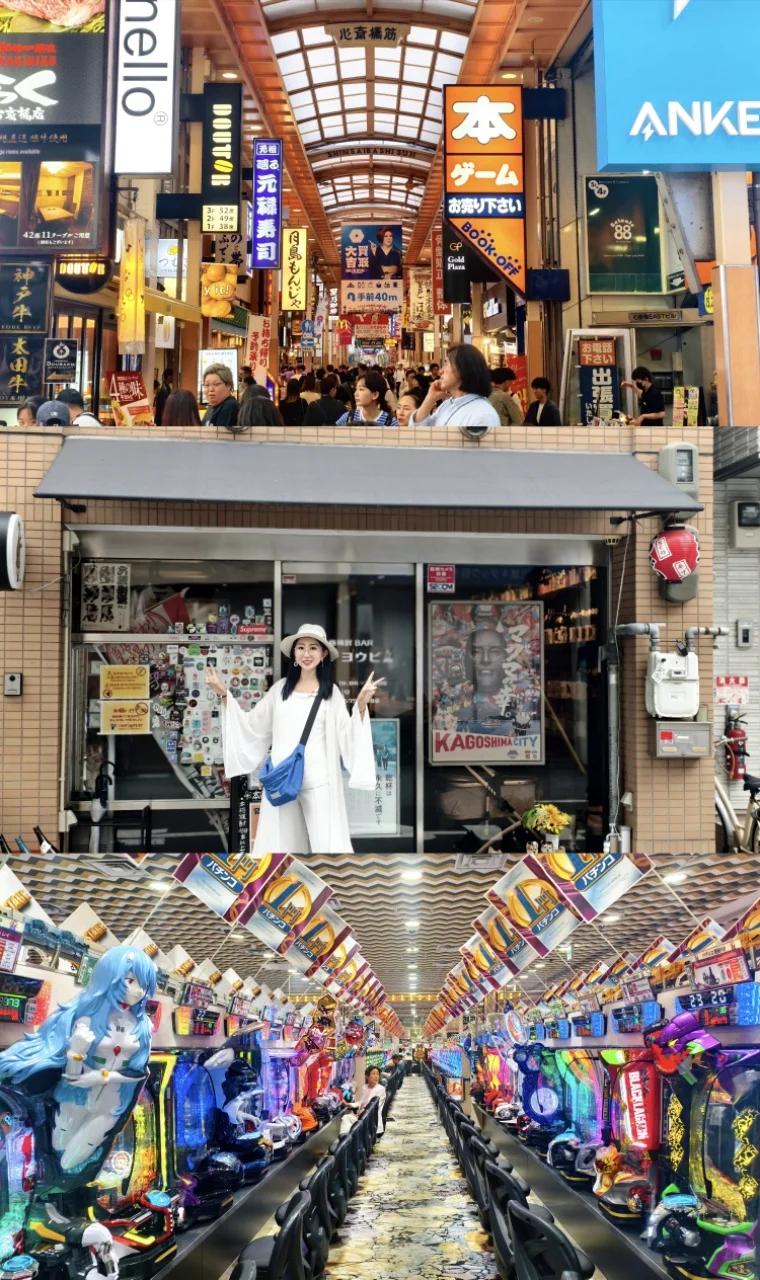 青石板路两旁是爬满绿植的复古屋舍,偶遇一家宠物店,一下子就被吸引住了!👀 透过明亮的玻璃窗往里看,猫猫正慵懒地打发时光,还有几只小狗围着架追逐打闹,每一幕都萌到犯规~✨拐个弯就被眼前的霓虹闪到挪不开脚!🤩一整排弹珠机发出的炫彩灯光,还有EVA绫波丽的巨型立牌,Hello Kitty和小熊维尼的玩偶,直接把我拉回二次元世界!。