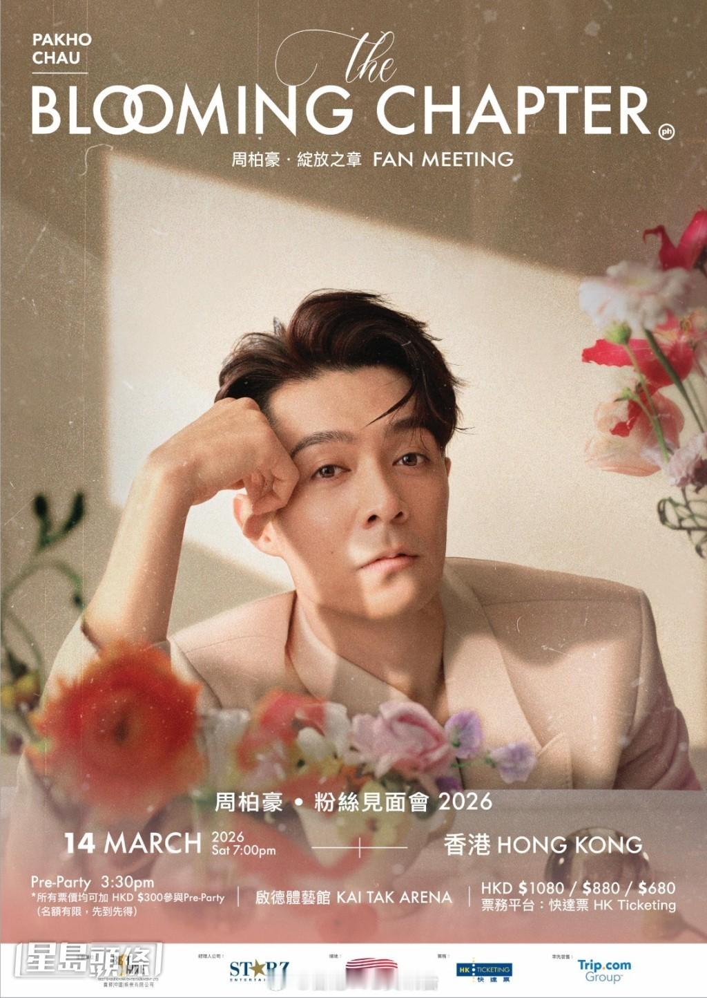 星岛:周柏豪相隔7年回港开骚 揭见面会惊喜:唔输红馆个唱周柏豪个人音乐见面会《周柏豪 THE BLOOMING CHAPTER》将于3月14日白色情人节举行,首站选在香港启德体艺馆。相隔7年再回港开骚,柏豪直言:“真是有点耐,屋企人、朋友都问,你几时巡返香港呀?终于可以好开心同大家讲,今次由香港出发!”见面会海报除了帅之外,亦充满春天气息,柏豪表示,“对男人来讲,我到了40岁呢个年纪,我估应该展现到不同的一面俾大家,一个新的绽放,所以我哋海报都是用绽放为题。”柏豪表示制作越搞越大第一站选在香港,柏豪表示:“当然係会有好多新构思,巡回见面会已经做近两年,之前都巡了好多城市,26年新的一次巡回,係自己屋企第一站,个骚内容同制作真是越搞越大,因为係香港做骚限制同外面不同,好多嘢可以玩,所以今次係同上年个巡回好唔同,规模与内容不断丰富升级,完全不会比正规演唱会‘少嘢睇、少歌听’,甚至在心思、时间和力气的投入上比以前演唱会更多。”柏豪想学Tyson玩插水对于新一轮巡演,柏豪自言放下一千分的力,全情投入跟导演研究,精心设计好多新环节。问有什么新刺激在香港玩?例如除衫、插水或吊威也?柏豪笑道:“我都见到上次Tyson玩插水,如果我跳落台,大家係肯定接得住我,我不怕跳㗎……哈哈!吊威也我都想呀,成日都好想试下台前拂去观众席那种感觉㗎!”又表示选址于启德体艺馆,也是与团队一起挑选。香港站之后,柏豪会继续世界各地新一轮巡演,“我是充满期待㗎,今次会再去啲新城市,演出之余又可以体验不同文化旅程,读万卷书不如行万里路嘛!”
