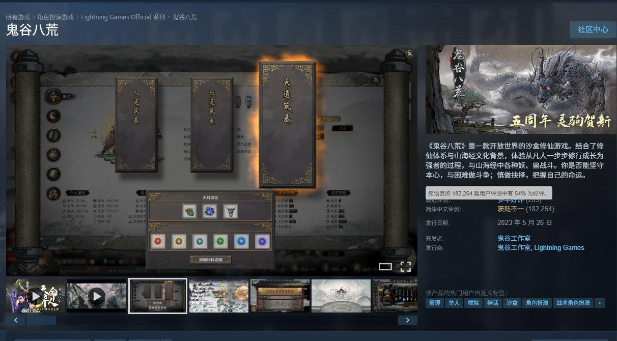 沙盒修仙游戏《鬼谷八荒》目前在Steam享新史低优惠,折后37.4元,目前国区好评率为54%,收录超180000篇玩家评测。本作结合了修仙体系与山海经文化背景,你将在游戏中体验从凡人一步步修行成长为强者的过程,与山海经中各种妖、兽战斗。你是否能坚守本心,与困难做斗争;慎做抉择,把握自己的命运。