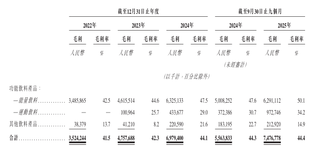 招股书显示,2025年前三季度,东鹏特饮实现营收125.63亿元,其占总营收比重高达74.6%,同时毛利率高达50.1%,仍是业绩增长的主力军;但从增速上看,同比增速为19.35%,相较于之前的营收增速已有所放缓。