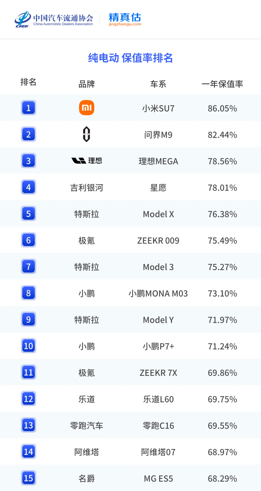 雷军回应小米su7保值率第一名 SU7的保值率是真的无解,直接打了一个25年电动车保值率第一,对比一下24年保值率最高的ModelX和23年的Taycan,而SU7直接达到86%,远超这两个,真的强!关键这是小米汽车第一次上榜,就直接第一了,只能说小米在二级市场也是受到大家的认可的以前都说买特斯拉是更保值的,现在没想到吧,国产也可以保值,而且保值的更猛 买车就得买保值率高的,老款SU7这么能打了,更加期待新SU7的表现了。