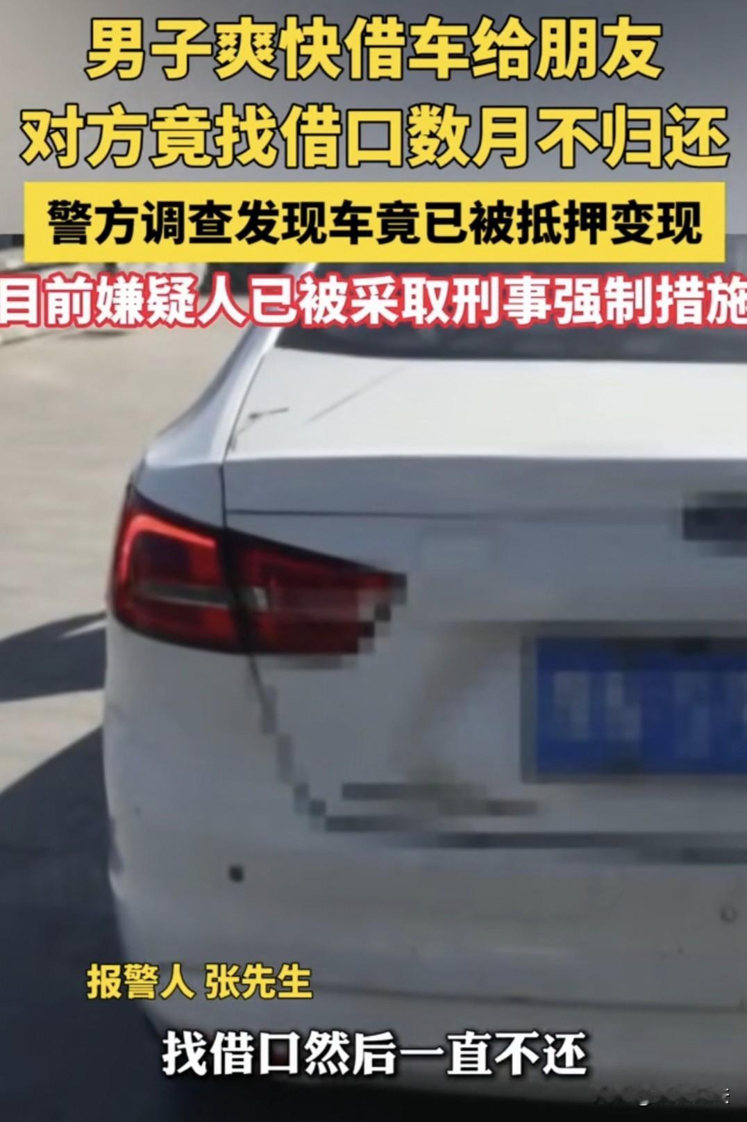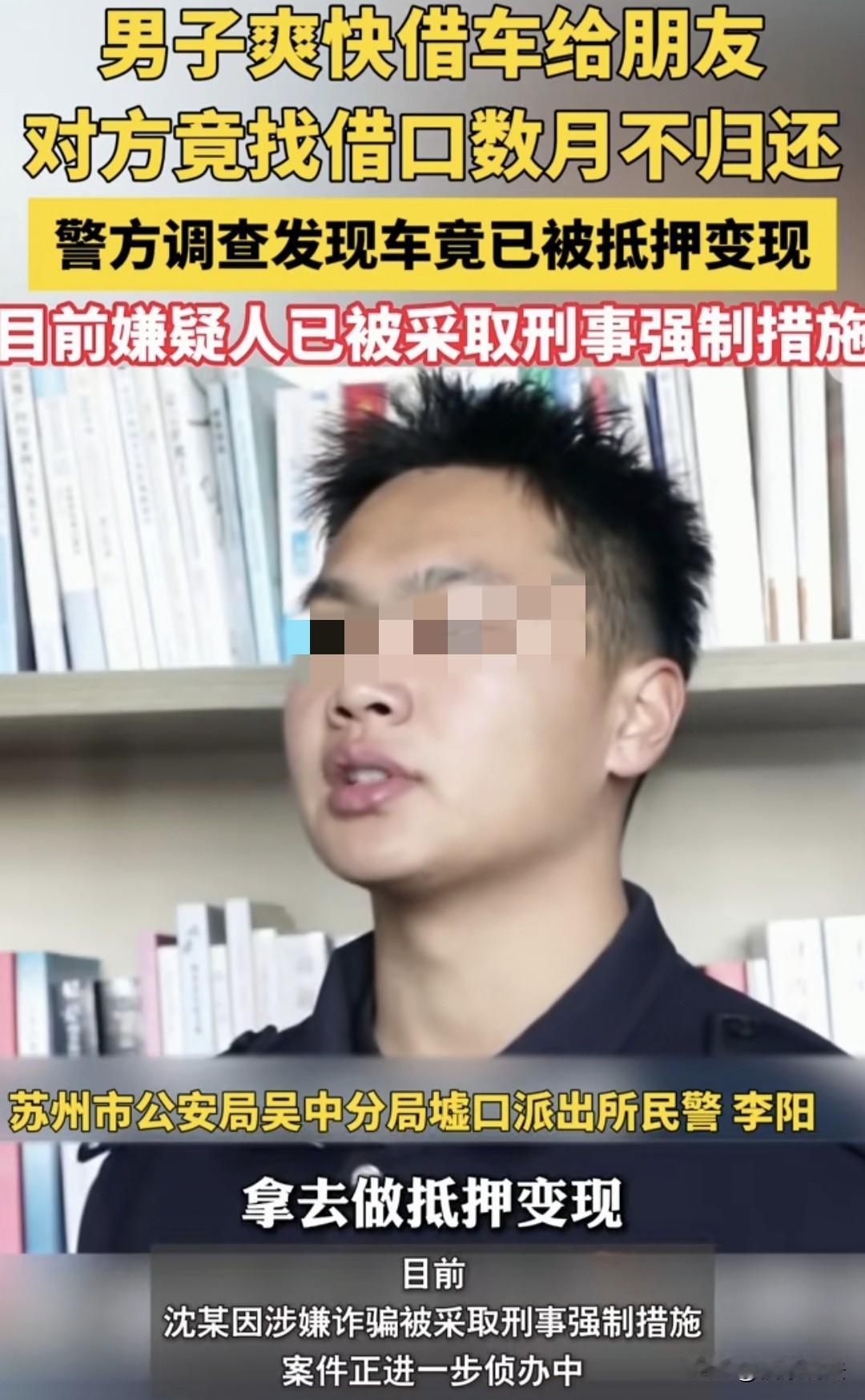 “车与老婆不能外借!”江苏苏州,男子的朋友借走他的车,说送东西几分钟就回来。结果,拖了几个月不还,还失联了。男子无奈报警,才发现车被朋友抵押换钱了,而朋友借车背后的原因,却令他心寒!网友:不是车主,怎么抵押的? 2025年8月,张先生的朋友沈某找上门说:“兄弟,借个车,送个东西,几分钟就回来。” 因为时间短,张先生出于对朋友的信任也没多想,觉得都是朋友,这点小忙不帮显得生分。于是,车钥匙交出去了。 但这一交,就成了“肉包子打狗,有去无回了”。 沈某借走车之后,就没了动静,张先生也一直没等到他来还车,便问他什么时候还车? 可沈某压根就没想还,一开始还找借口拖延,今天说“明天还”,明天说“后天还”。 后来干脆玩消失,电话不接、微信不回,直接失联。 这下张先生才反应过来:坏了,可能被沈某坑了! 这时候张先生做了个很正确的决定:报警。 一开始,民警好几次联系沈某让他配合调查,可没想到,沈某耍上无赖了,就是不配合。 警察介入后,这事儿的真相终于浮出水面。 沈某以为不配合就能逃脱责任,但民警最终将他抓获。 这回沈某也老实交代了,他根本不是去送什么东西,而是因为创业失败欠了一屁股债,盯上了朋友张先生的车。 沈某的算盘打得噼里啪啦响,想把张先生的车骗到手,直接开去抵押变现,换成现金去填窟窿。 所以,借车的时候,他压根就没想还。 如果是真借车送东西,哪怕半路车坏了,或者因为急事用久了,那是民事纠纷,顶多赔钱。 但沈某是“借”的那一刻,就已经把车当成了变现的工具。 他用谎言掩盖了非法占有的目的,这就是刑法里典型的诈骗。 车一到手直接抵押,这跟偷了车去卖有什么区别?甚至比偷更恶劣,因为他透支了朋友的信任。 我对这事儿有3个特别想吐槽的点: 第一,千万别高估“朋友”这两个字的含金量。 沈某为什么找张先生借?因为熟人好下手!熟人之间有信任基础,防备心低。 沈某就是利用了张先生的“面子薄”和“讲义气”。现实中,越是这种拍胸脯保证“就用一下”的,越要小心。 真正的朋友,借车会主动加满油还回来,甚至给你洗好车;那种借走就没影的,连陌生人都不如。 第二,抵押车这个环节,水太深。 沈某能把别人的车抵押出去,说明要么是车行审核不严,要么是他用了什么假手续。 有网友说,这个抵押就相当于典当,不是借款的那种车行的抵押。 也有网友分享,车子没有任何手续就可以抵押,19年我的车被朋友开去,也是拿去抵押了,后面自己花五万块钱拿出来的,那个人写个借条给我,现在人都找不到了。 这也给咱们提了个醒:买二手车、做抵押,必须核实车权属。 如果车不是他的,这抵押就是无效的,但对张先生来说,车被抵押了,哪怕最后赎回来,心里也得膈应好一阵子,这车以后还能不能开?想想都晦气。 第三,报警要趁早,别等“失联”了才着急。 张先生在沈某开始找借口拖延的时候,其实就应该警惕了。很多人觉得“为了辆车报警至于吗”或者“再等等看,也许他真有急事”。 千万别这么想!一旦对方开始推脱,立刻查GPS(如果有的话),或者直接去要。 一旦发现失联,马上报警,这次是警方给力,通过侦查把人抓了。 要是沈某跑得快,或者把钱挥霍光了,张先生就算赢了官司,也可能拿回一辆空壳车,甚至连车都没了。 最后说说结局。 目前,沈某被采取了刑事强制措施,这辈子大概率要留案底了。 为了骗一辆车,变现那些钱,不惜触碰法律底线,值得吗? 也许在他看来可能值得,因为他急红眼了。但这就是赌徒心态的下场——不仅输了钱,还输了自由,更输了做人的底线。 虽然,沈某让家属委托赎回了车辆,张先生的物质损失大概率能挽回,但张先生的“精神损失费”谁赔?被信任的朋友背刺的感觉,恐怕很久都缓不过来。 所以,通过这件事给咱们提了一个醒:车与老婆,概不外借。哪怕是最好的朋友,涉及到大额资产,也要立字据、查去向。毕竟,在巨额债务面前,人性经不起考验。别让别人利用你的善良。 你怎么看呢?