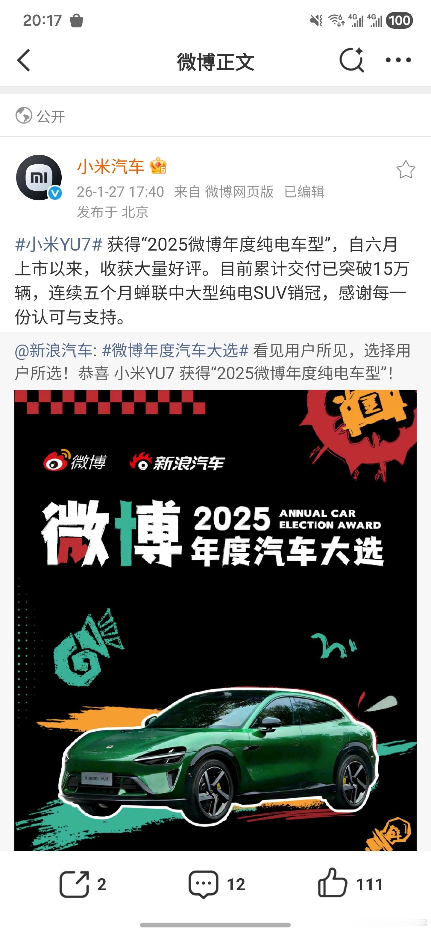 小米YU7斩获微博年度纯电车型,说实话这奖拿得毫无悬念,不信咱就看看数据: 连续5个月中大型SUV销冠,12月无定语第三、SUV不分能源第二!上市3分钟狂揽20万订单,半年交付超15万!这还是在产能爬坡期,未来不敢想!目前唯一能跟Model Y正面刚的选手,没有之一,这正是百万网友严选! 要知道YU7 获得了 J.D. Power新车质量榜首,2200MPa超强钢量产首发,24小时耐力赛3944公里破纪录,浙赛百万最速SUV,冬夏续航测试全第一!就连海外媒体直呼"给特斯拉猛烈一击",开过了才知道多香,说实话, YU7 已经不是车了,而是一种现象!