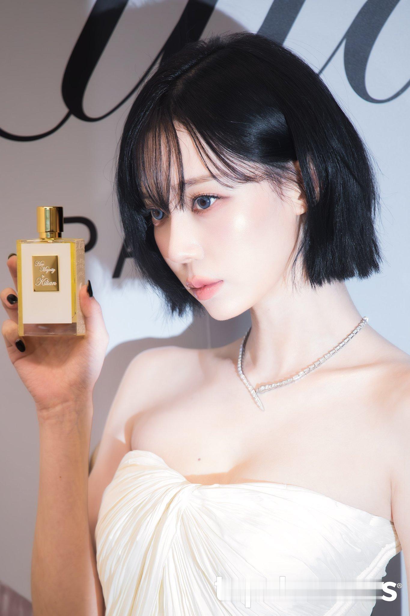 金玟庭 x Kilian ParisWinter一袭象牙白褶皱束腰抹胸长裙出席Kilian Paris香水活动,脚上碎钻高跟鞋与颈间的宝格丽珠宝项链相辉映~