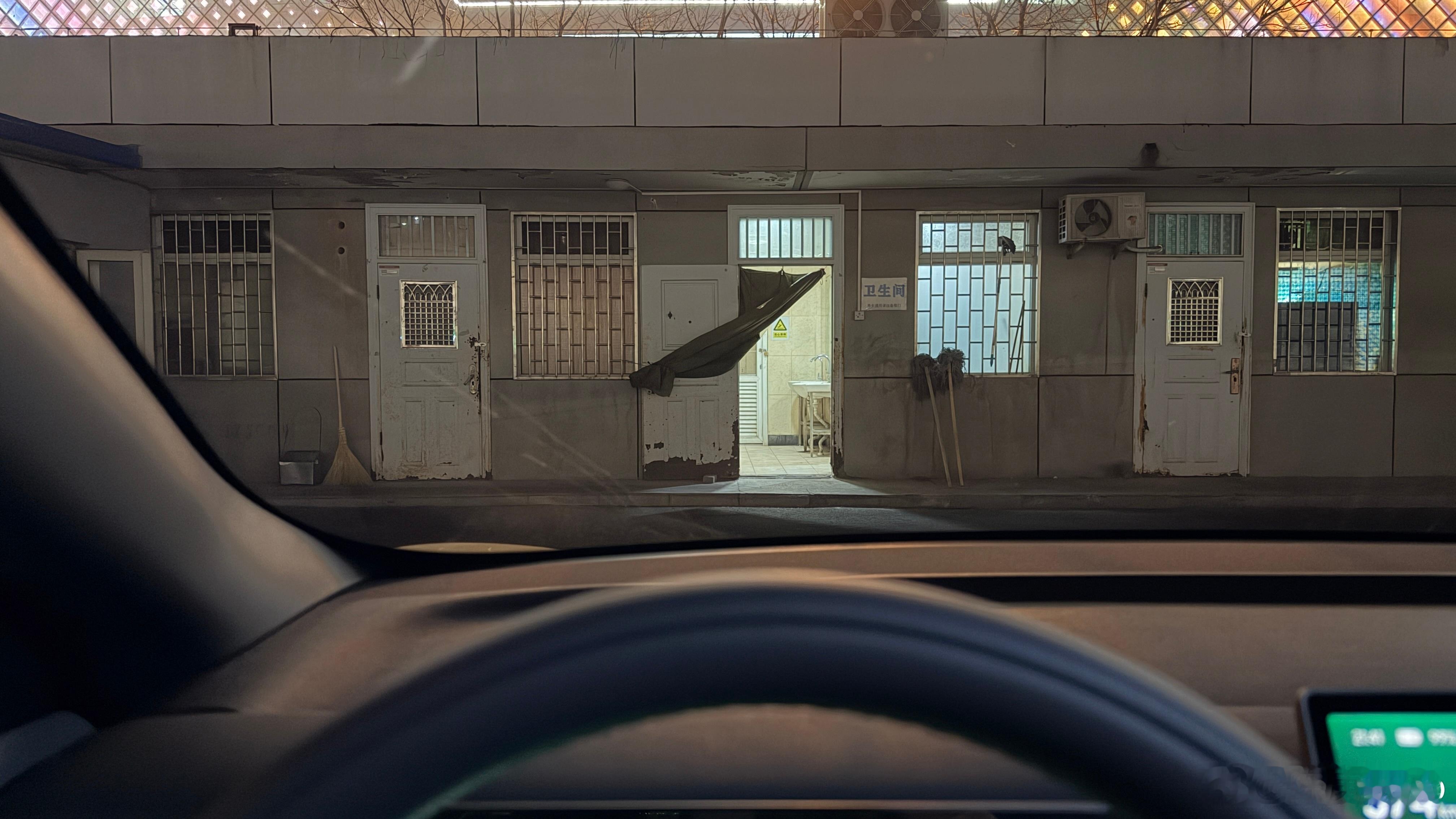 我说为什么都不停这个车位这充电呢相机拉高亮度一看嘿…..正对厕所