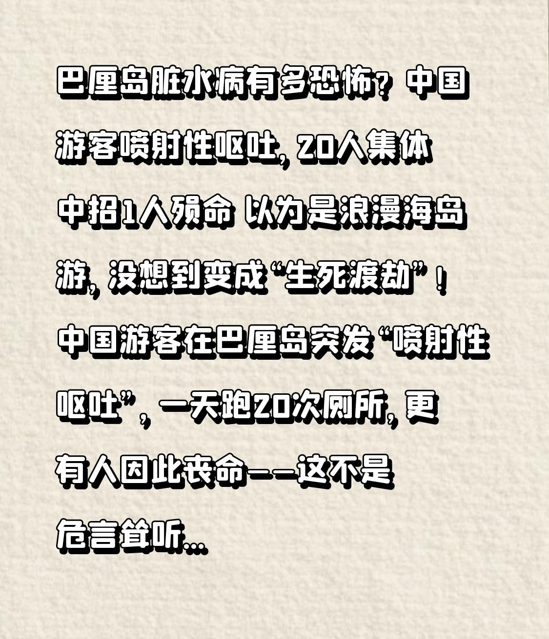 巴厘岛脏水病有多恐怖?中国游客喷射性呕吐,20人集体中招1人殒命 以为是浪漫海岛游,没想到变成“生死渡劫”!中国游客在巴厘岛突发“喷射性呕吐”,一天跑20次厕所,更有人因此丧命——这不是危言耸听,而是真实发生的悲剧,背后的“脏水病”早已成为海岛旅游的隐形杀手。 成都女孩小琳(化名)永远留在了巴厘岛。她预订的青年旅社在平台评分高达9.6分,可入住后没多久,就开始上吐下泻,呕吐物喷溅满地,浑身冷汗把床单浸透。同住的李女士更惨,凌晨4点吐到胆汁带血,脱水晕过去又醒来,最后血氧低至83,被直接送进ICU抢救。而小琳因为旅社工作人员的冷漠拖延,从发病到被发现离世,整整16个小时没人查看,错过了最佳救治时机。 更让人震惊的是,这场悲剧并非个例。短短两天内,该旅社至少20名住客集体中招,症状全是高烧39℃+喷射性呕吐+水样腹泻,医生诊断为急性肠胃炎,罪魁祸首就是巴厘岛臭名昭著的“脏水病”。这种病由诺如病毒、沙门氏菌引发,当地雨季污水横流,自来水大肠杆菌严重超标,商家用脏水制冰、洗食材,甚至刷牙漱口都可能中招。 你以为躲过 drinking 生水就安全了?大错特错!在巴厘岛,这些行为都可能让你“踩雷”:喝带冰块的饮料(商家所谓“纯净水制冰”多是谎言)、吃路边摊凉拌菜和预切水果、潜水时误吞海水,甚至用自来水刷牙洗脸。李女士回忆,她被旅社的流浪狗咬伤后,对方连消毒酒精都没有,只用红药水敷衍处理,卫生条件可见一斑。 更心寒的是旅社的后续操作:明知多人中毒,仍正常营业收费,篡改住客用餐记录,拒绝提供监控,直到家属报警才承认有人离世。而类似的“脏水病”案例,在巴厘岛早已屡见不鲜,当地华人透露,雨季中招游客比平时多三成,不少人因延误治疗引发感染性休克,甚至器官损伤。 其实这场悲剧本可避免。中国驻登巴萨总领馆早就提醒:去巴厘岛要把瓶装水当“万能水”,喝水、刷牙、洗菜全用它,不买路边散装食品,饭前必洗手。可太多人被海岛美景冲昏头脑,忽视了这些安全细节。 浪漫旅游不该以健康为代价,每一次出发都该把安全放在首位。希望小琳的悲剧能敲响警钟,也希望相关部门能严查涉事旅社,让跨国维权不再艰难。如果你计划去巴厘岛,一定要收藏这份安全指南;也欢迎分享你知道的旅游避坑技巧,让更多人远离风险。评论区聊聊,你旅游时遇到过哪些卫生隐患?