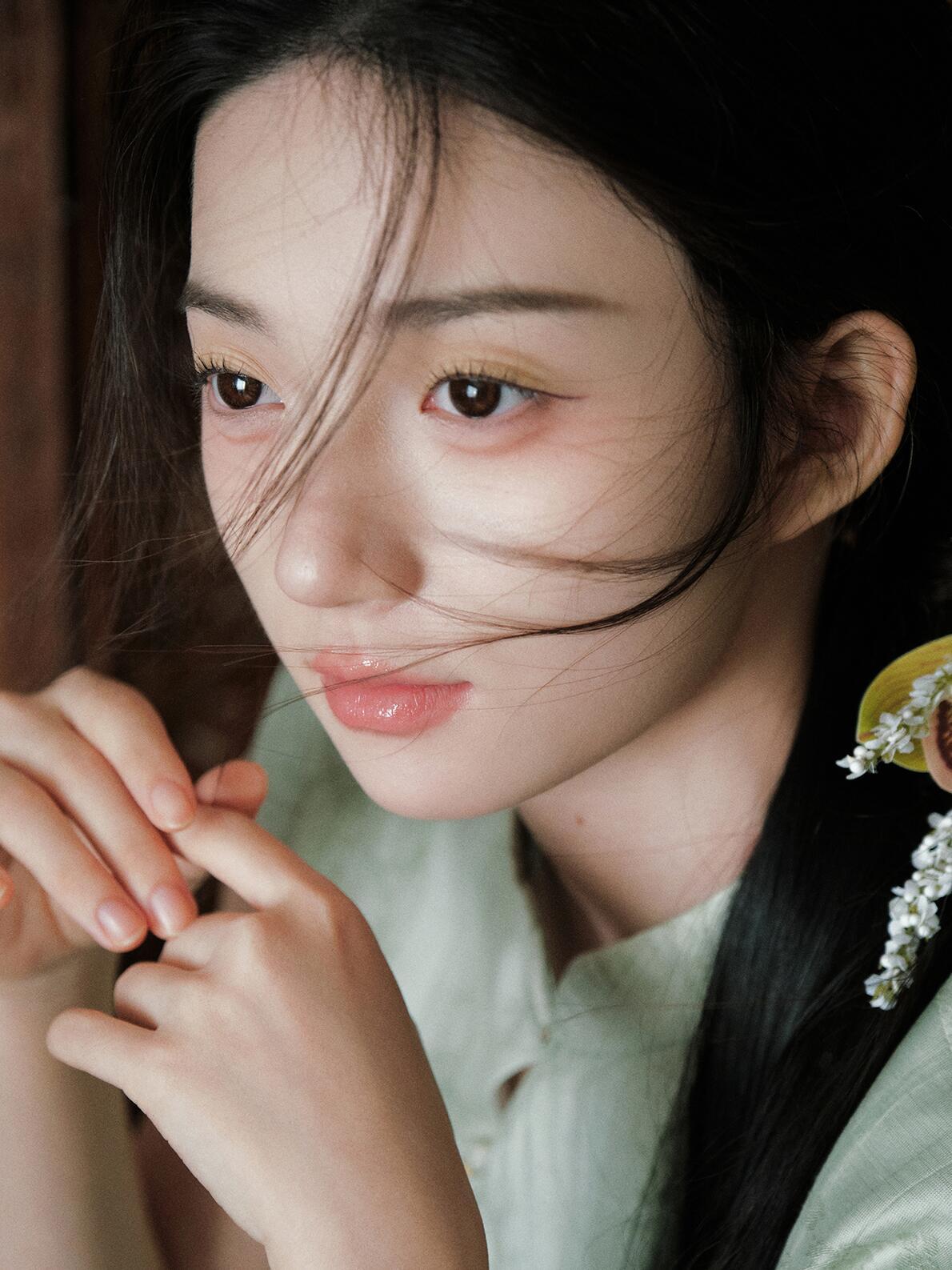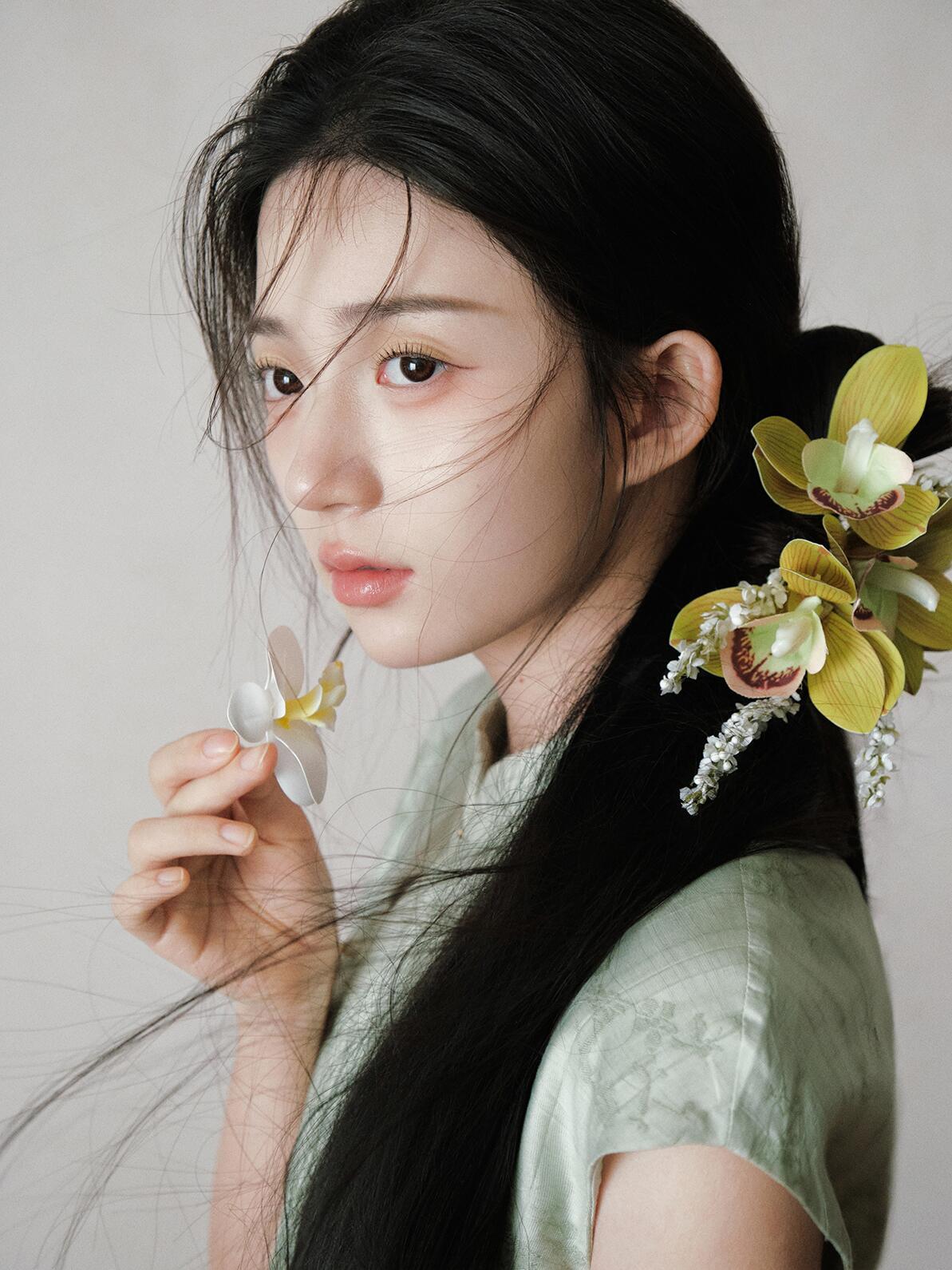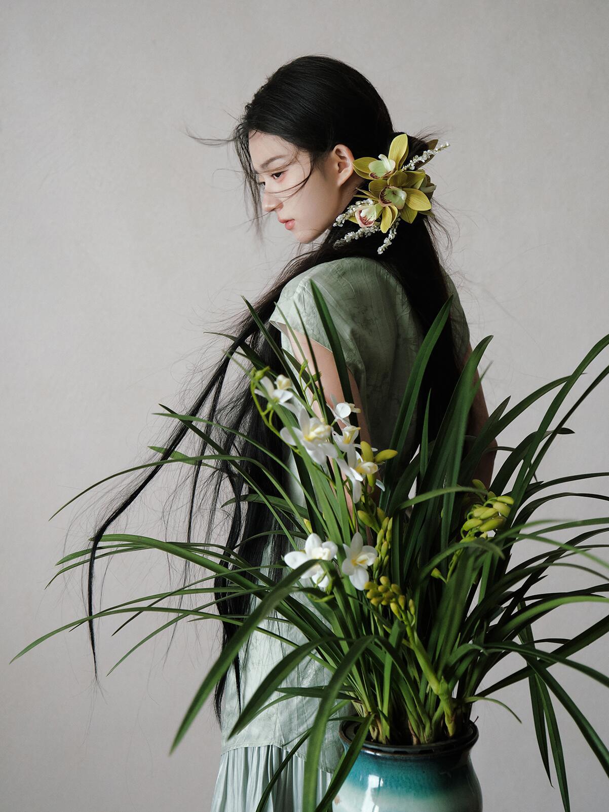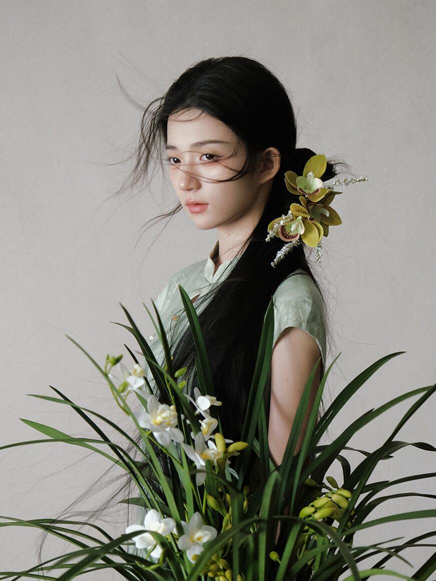 作品将人物与兰花的融合推向极致,模特半隐于兰草之后,仅露出的面部与花枝形成虚实交错的视觉效果。这种处理方式模糊了人与自然的边界,营造出物我两忘的东方意境。 浅灰色的背景让主体更加突出,模特的眼神平静而深邃,仿佛在与兰花进行一场无声的对话。构图上采用对称式布局,让画面在平衡中透出稳定感,兰草的线条与模特垂落的长发形成的纵向延伸,进一步强化了画面的静谧氛围。 光线的均匀分布让画面质感细腻,没有明显的光影死角。如果能在模特的手部增加一些细节动作,比如轻触花瓣,可让画面的叙事性更完整。