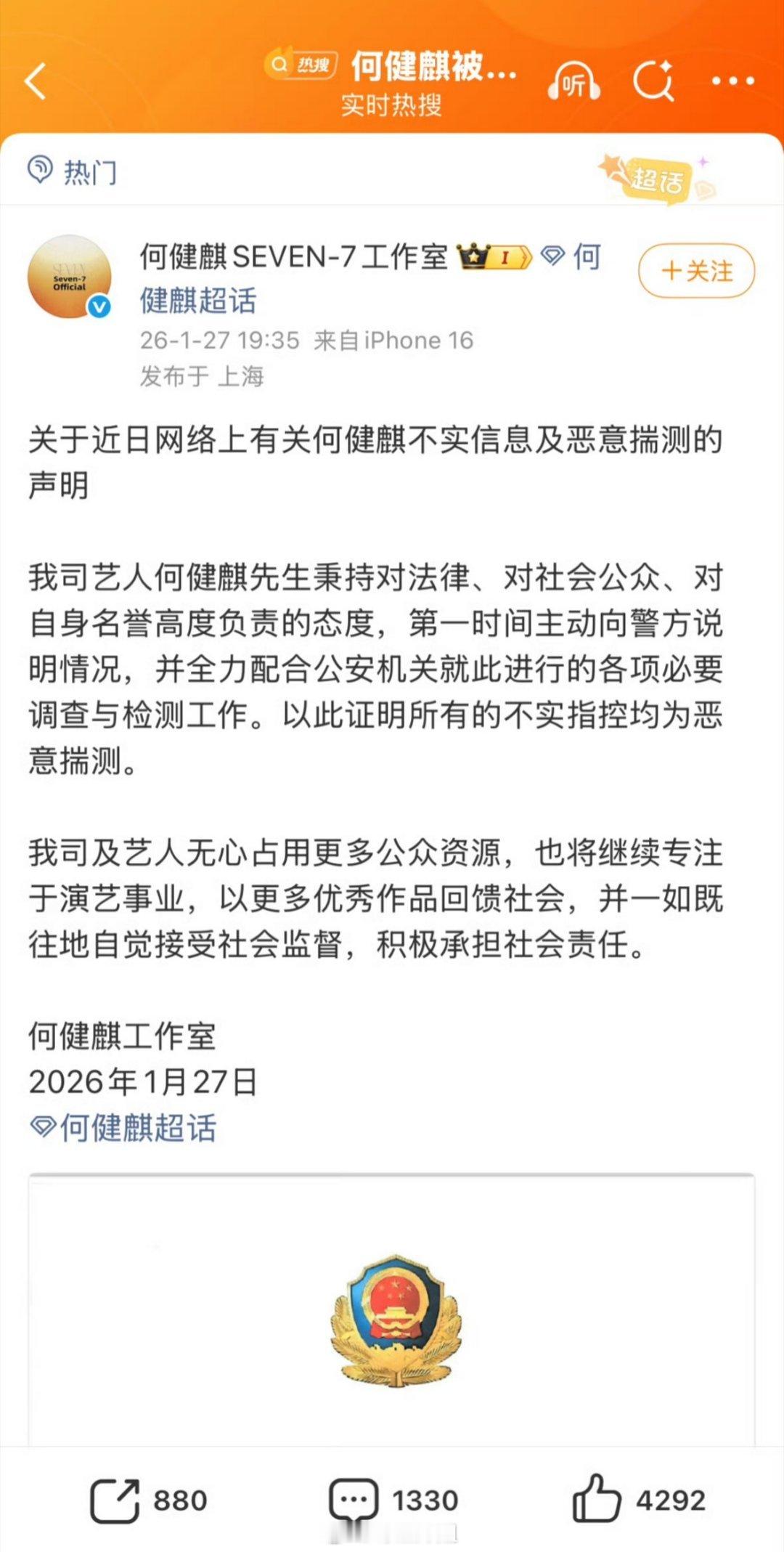 何健麒工作室发严正声明继何健麒方发严正声明并提交报案回执后微博也提出另一方当事人