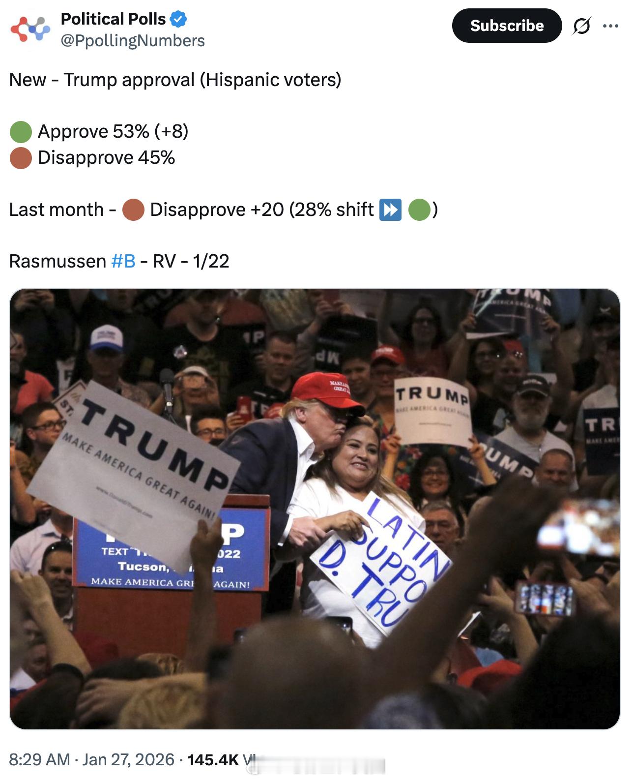 虽然ICE最近在明尼苏达针对非法移民的行动争议不断,但最新的两个民调显示,川普在拉丁裔选民中的支持率暴增:1. 最新的Emerson College全国民调中,43.3%的拉丁裔选民表示认可川普总统的执政表现,45.4%表示不认可,而在同一项民调2025年12月的调查中,只有28.2%的拉丁裔选民表示认可,57%表示不认可。2. 最新的Rasmussen民调中,拉丁裔选民对川普的工作表现:53%认可,45% 不认可,净支持率+8%,而上个月该民调的净支持率为-20%。主要原因可能来自抓捕马杜罗,以及在加强边境管控、打击毒品暴力犯罪方面加强。