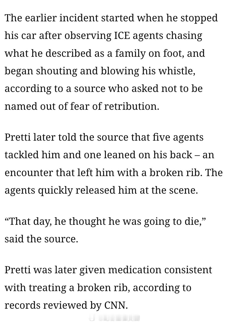 CNN:Alex Pretti 在死前一周与联邦特工发生冲突,导致肋骨骨折:一名匿名的消息人士透露,这起早前的事件发生在Pretti看到ICE特工追捕非法移民时,他停车后开始大声喊叫并吹响口哨。随后有五名特工将Pretti扑倒,其中一人压在他背上,这一冲突导致他肋骨骨折,但特工们很快就在现场将他释放。Pretti向这位消息人士透露,“那一天,他以为自己会死。”据CNN查看过的记录显示,Pretti随后接受了与治疗肋骨骨折相符的药物治疗。海外新鲜事今日焦点