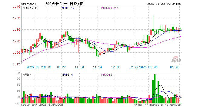 1月28日,沪深300成长ETF华夏(159523)开盘涨0.62%,报1.304元。沪深300成长ETF华夏(159523)重仓股方面,宁德时代开盘跌0.45%,贵州茅台涨0.00%,紫金矿业涨1.95%,阳光电源跌0.42%,海光信息涨2.05%,兴业银行跌0.05%,中国平安涨0.86%,招商银行涨0.05%,恒瑞医药涨0.42%,东方财富涨0.00%。