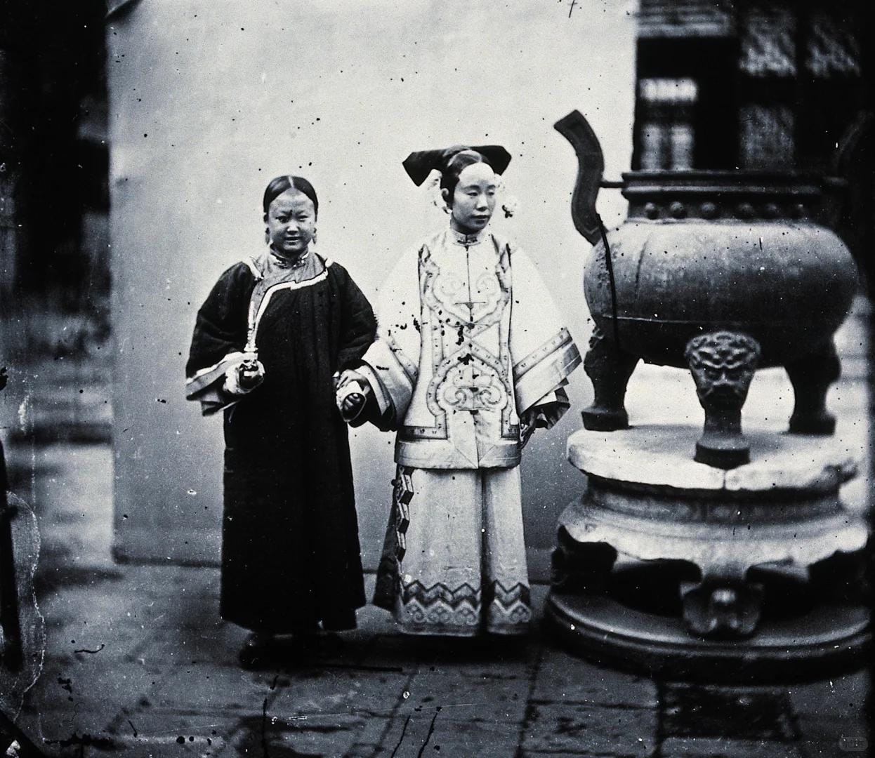 这张老照片,是晚清贵族府上的两位旗人女性的瞬间。 画面右侧的女子是核心人物,她身着一套华贵的旗装袍服上,布满繁复的刺绣纹样,领口与袖口的镶边工艺精致考究;旗头高耸,点缀着小巧的头饰,尽显晚清贵族女性的雍容仪态。她微微侧身,目光望向远方,神态沉静而带着疏离感。 左侧的侍从穿着一身深色旗服,款式简洁素雅,仅在领口处有细微的镶边装饰。她双手拢在袖中,身体微侧,姿态恭谨地陪伴在主人身侧,目光平和地看向镜头,与主人的华贵形成了鲜明的身份反差。 中式庭院右侧的三足铜香炉体量厚重,炉身与基座的兽纹雕刻古朴威严,透露出这是一处规格较高院落;墙面与砖石地面的斑驳质感,也为这张照片增添了岁月的厚重感。