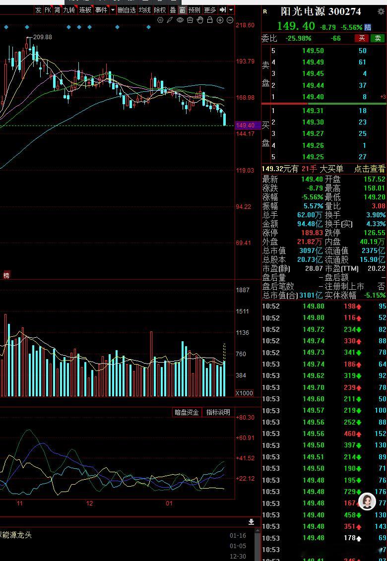 说下最近亏钱效应比较强的板块,那就是昨天加速下跌的储能电新这里的情绪都包含在阳光电源和宁德时代下面从1月9日以来宁德几乎是每天阴跌 阳光也在加速下跌这个感觉是原材料涨的太厉害了,大厂都怕按这个价格出来的成品传导不到市场上去,怕生产出来的产品站岗了。所以就导致上下游齐跌了,材料这几天也不好,因为电池产的顾虑,上游供应端也要打个问号要是有谁持有这些就会很难受,这就是散户的信息差
