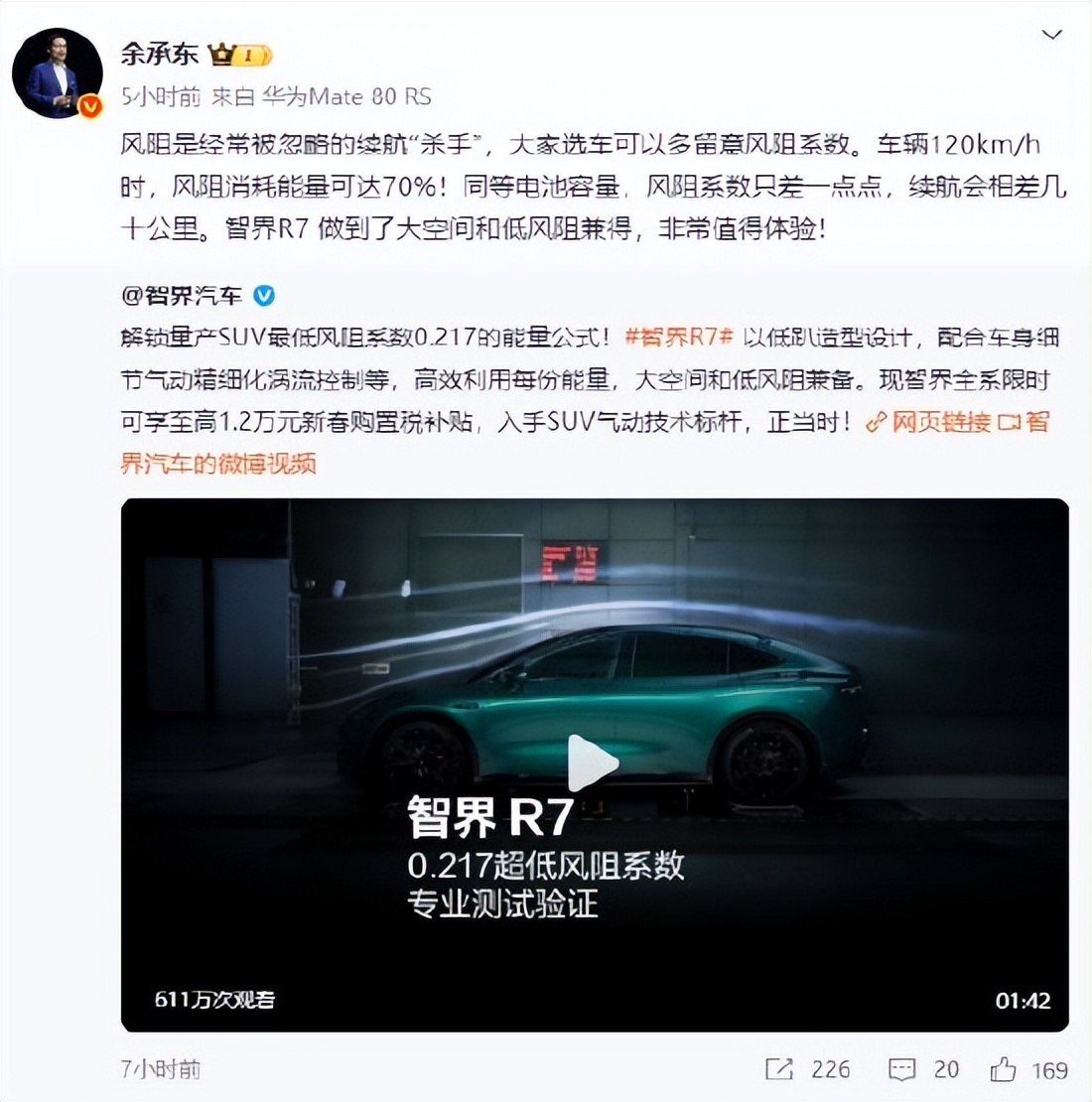 余承东:风阻是经常被忽略的续航“杀手”