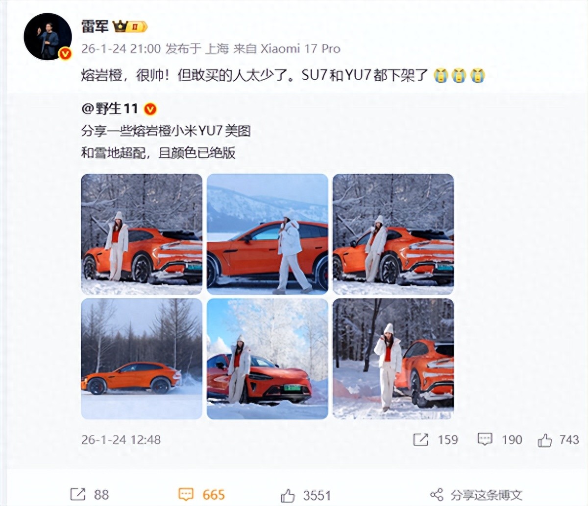 1月24日晚,雷军通过个人微博称赞小米汽车熔岩橙配色。不过,他表示,“这个颜色很帅,但敢买的人太少了,目前小米SU7和YU7都下架了熔岩橙配色”。雷军还在评论区称,“一款车漆,好看而且大家都敢买,实在太难”。