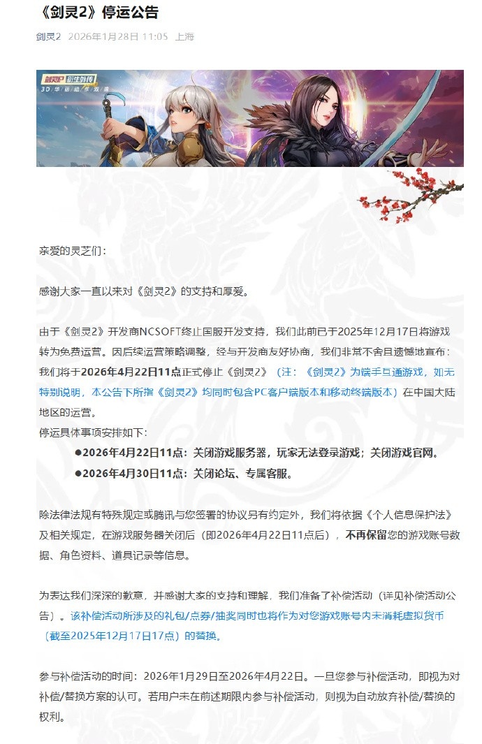 直播吧1月28日讯《剑灵2》官方发布停运公告,宣布游戏将于2026年4月22日11点正式停止在中国大陆地区的运营。