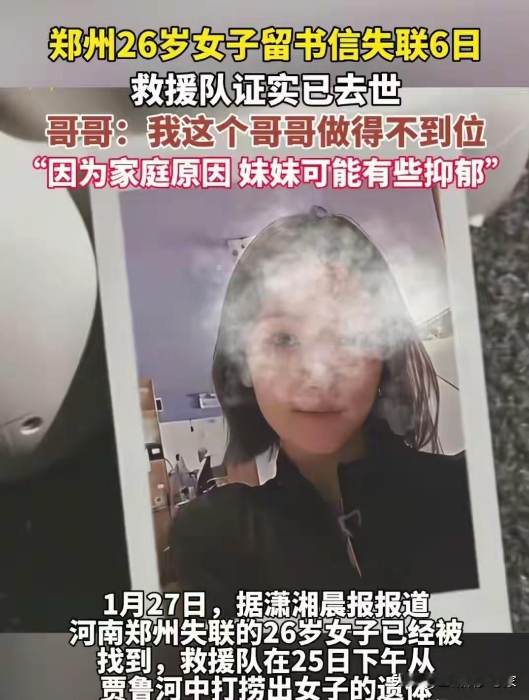 痛心!26岁护士失联6天,遗体打捞上岸,哥哥自责落泪 26岁李文丽,终究没熬过这个冬天。 1月20日晚,她从郑州出租屋出门,没带手机,没拿工牌,只揣零钱、攥着书,还留了信。她乘地铁到北大学城,走向贾鲁河,从此失联。 6天里,哥哥沿河呼喊,救援队破冰搜寻,网友揪心等待,等来的却是噩耗——1月25日,她的遗体在贾鲁河被打捞,穿着离家时的白衣黑裤白靴,人却永远走了。 她是三甲医院护士,温柔懂事,却总说“活着累”。哥哥红着眼自责:“我忙着生计,没接住她的求救。” 如此年轻的生命,用这样的方式结束,是对自己不负责,更是对亲人不负责。她走了,留下哥哥一生愧疚,亲友无尽遗憾。 愿她来世无苦,被温柔以待。也愿我们多倾听身边人,别让悲剧再重演。 郑州李文丽 26岁护士失联 贾鲁河 珍惜生命