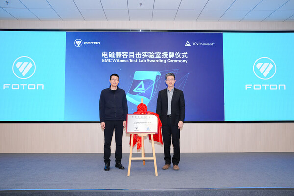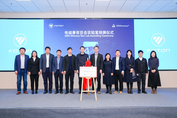 北京2026年1月28日--1月23日,国际独立第三方检测、检验和认证机构德国莱茵TÜV大中华区(以下简称"TÜV莱茵")与北汽福田汽车股份有限公司(以下简称"北汽福田")举行电磁兼容目击实验室授牌仪式,标志着北汽福田试验中心电磁兼容实验室正式获得E-mark认证TÜV莱茵目击实验室资质。北汽福田业务副总裁、海外事业部总裁付军,工程研究总院常务副院长郭凤刚、海外事业部研发副总裁王秋香,TÜV莱茵大中华区交通服务高级副总裁黄余欣、销售总经理李卫英等双方代表出席了授牌仪式。
