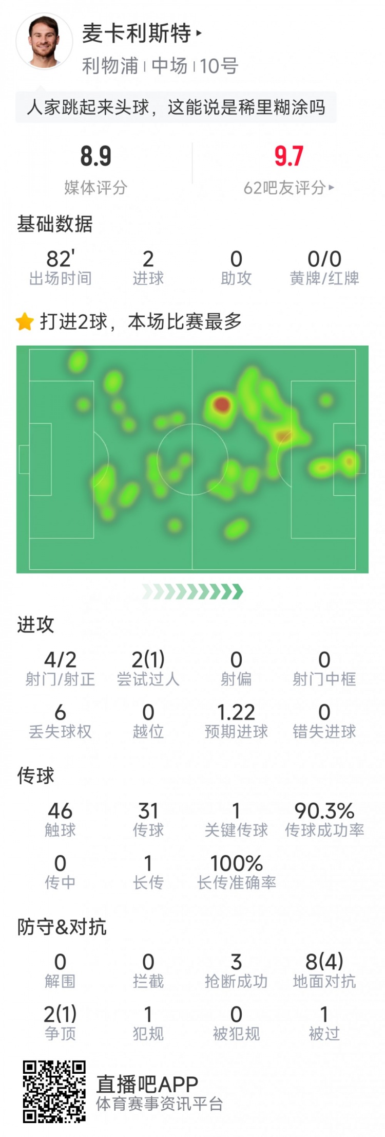 麦卡利斯特本场数据:梅开二度,4射2正,1次失良机,3抢断
